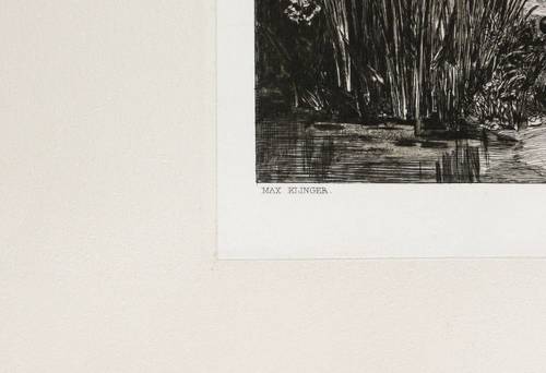 Singer 62 III. – In der Platte links unten gestochene Signatur: ″MAX KLINGER.″ Rechts römische Blatt-Nr.: ″XI.″ – Blatt 11 aus dem Zyklus ″Intermezzi Opus IV″. – Unbeschnittenes Exemplar. Leichte Randmängel. Kleiner Randriss oben fachgerecht geschlossen. Mäßig guter bis guter Zustand.