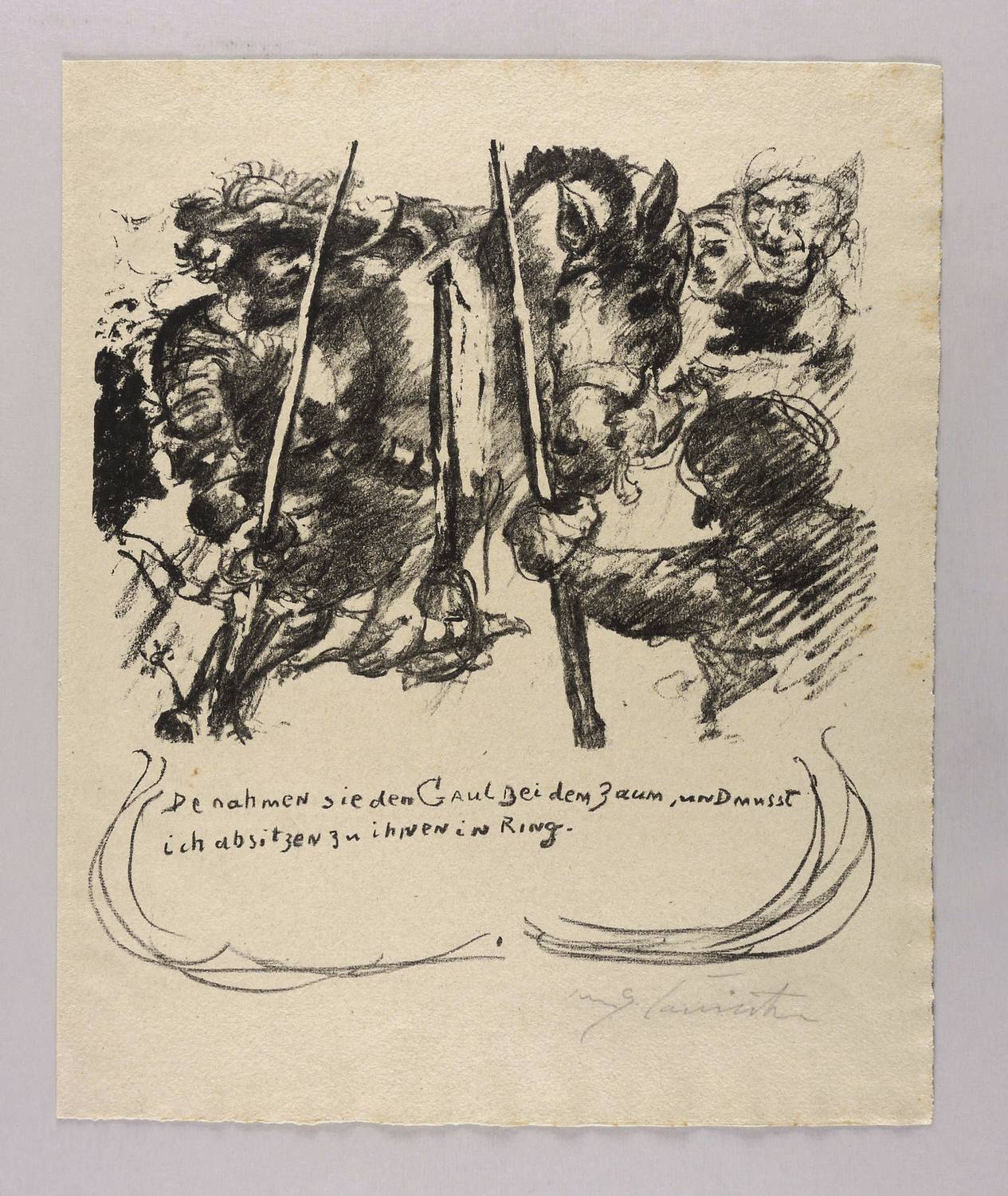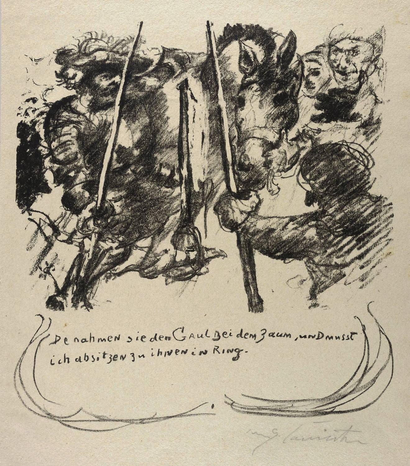 Schwarz L 399 XII. – Aus: Lovis Corinth, Das Leben des Götz von Berlichingen, von ihm selbst erzählt (Berlin: Fritz Gurlitt 1919). – Rechts unten in Bleistift signiert: ″Lovis Corinth″. Im Stein unterhalb der Darstellung Inschrift: ″De nahmen sie den Gaul Bei dem Zaum, und musst ich absitzen zu ihnen in Ring″. – Im Verlag von Fritz Gurlitt erschienen. Druck der Gurlitt-Presse. Exemplar aus der 125 Drucke zählenden B-Ausgabe auf sogenanntem Altbütten. – Originalrandiges Exemplar. Sehr guter Zustand.