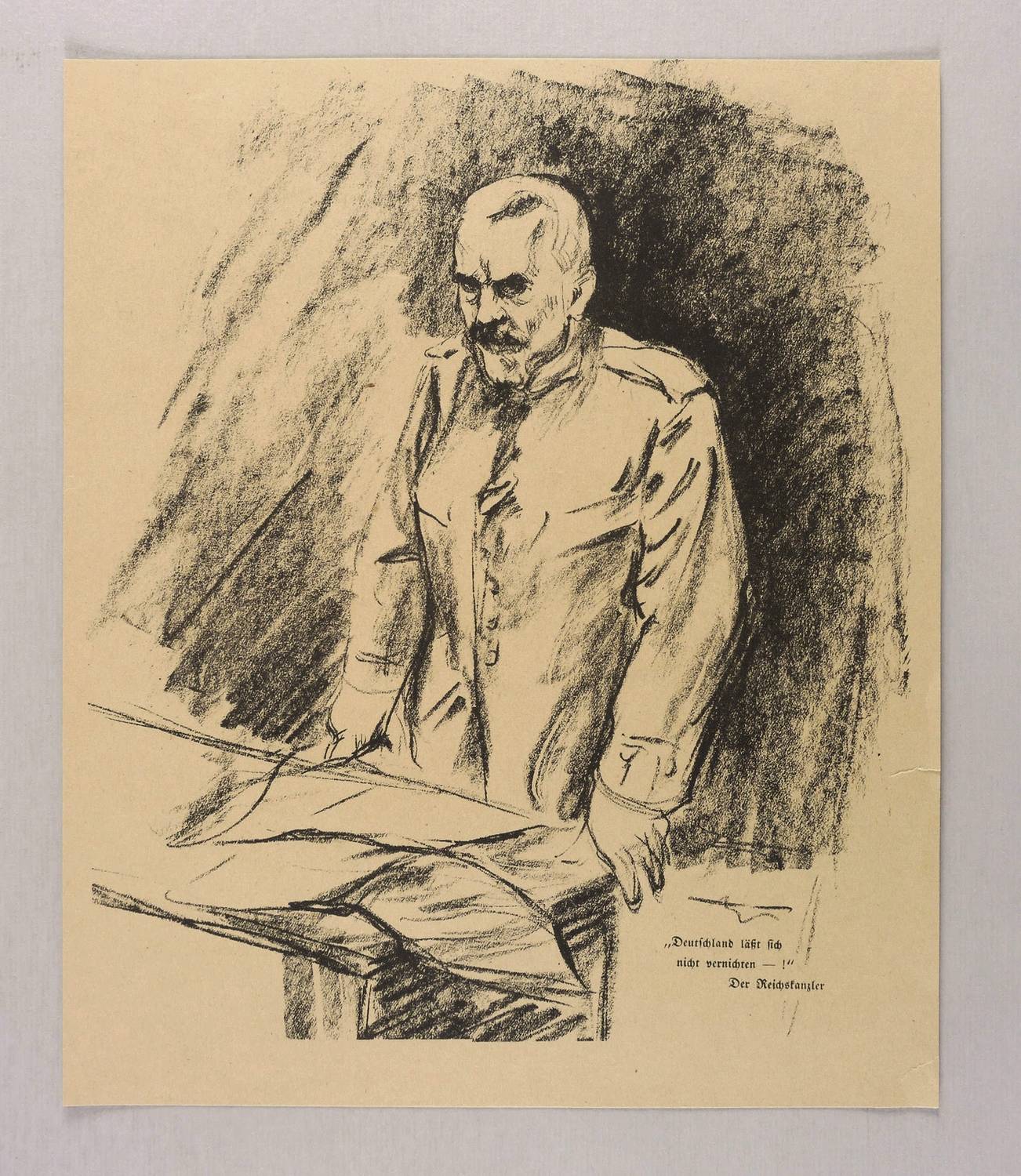 Schiefler 182 b (von b). – Aus: Kriegszeit. Künstlerflugblätter (Berlin: Paul Cassirer & Alfred Gold 1914-1916). – Nicht handsigniert. In der Darstellung rechts unten typografisch bezeichnet: ″'Deutschland läßt sich nicht vernichten - !' Der Reichskanzler″. – Der Reichskanzler von Bethmann-Hollweg in Uniform hinter einem Pult mit papieren stehend und redend. - Blatt aus der Ausgabe des Heftes Nr. 16 der ″Kriegszeit″. – Papier altersbedingt gegilbt. Kleiner Randriss rechts unten. Mäßig gut erhalten.