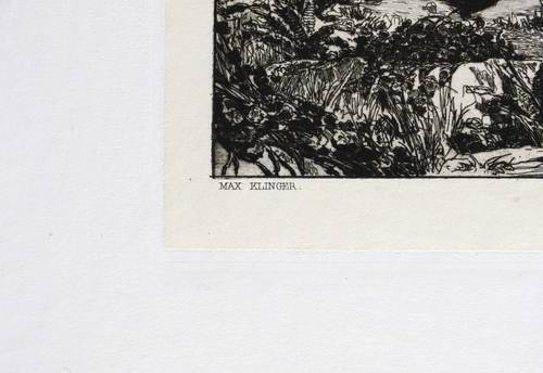 1881. Radierung / Strichätzung, in Schwarz, auf gewalztem China, auf Kupferdruckkarton. – Originale Künstlergrafik, von Max Klinger. – 23,0 x 39,6 cm (Darstellung / Einfassungslinie), 27,0 x 42,8 cm (Platte), 45 x 63 cm (Blatt).