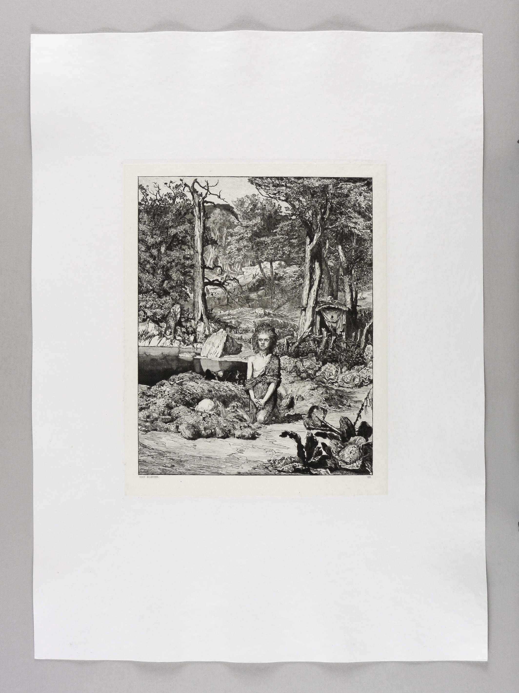 Singer 59 IV (von IV). – In der Platte links unter der Darstellung gestochene Signatur: ″MAX KLINGER″. Rechts Blattnummer: ″VIII.″ – Die Szene aus dem Roman Simplicius Simplicissimus in welcher Simplicius am offenen Grab des Einsiedlers hockt. - Schöner kontrastreicher Abzug bei Wiedergabe feinster Nuancen. – Originalrandiges Exemplar. Ohne Mängel. Sehr guter Zustand.