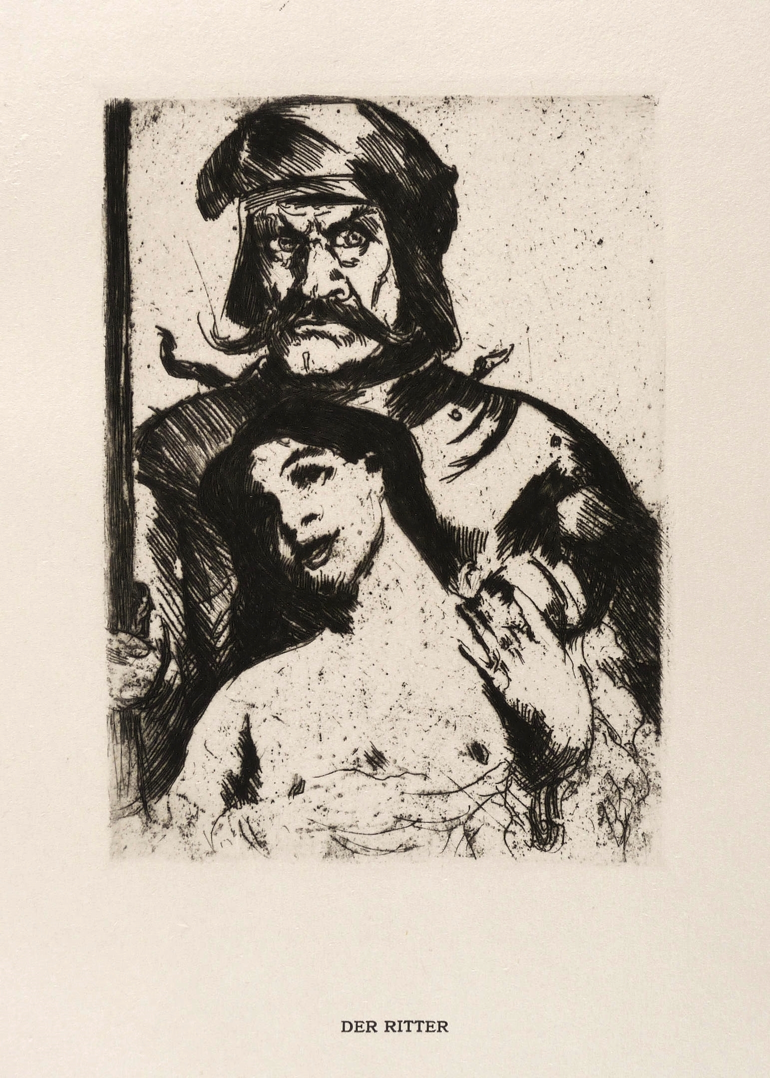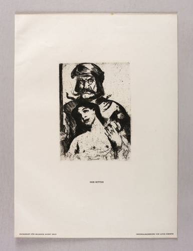 Schwarz 173 III (von III). – Aus: Zeitschrift für bildende Kunst (Leipzig: E.A. Seemann 1915), Bd. 26. – Nicht handsigniert. In der Blattecke rechts unten typografisch bezeichnet: ″ORIGINALRADIERUNG VON LOVIS CORINTH″. Mittig Titel: ″DER RITTER″. – Originalgrafische Beilage des Jahrgangs 26 von 1914/1915 der ″Zeitschrift für Bildende Kunst″. – Kleiner unscheinbarer Fleck in der oberen Blattkante. Sonst sehr guter Zustand.