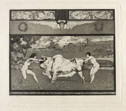 Max Klinger (1857 Leipzig - 1920 Großjena). Deutscher Bildhauer, Maler und Grafiker des Symbolismus. 1874/75 Studium an der Großherzoglich Badischen Kunstschule in Karlsruhe bei Karl Gussow und Ludwig Des Coudres, 1875 an der Königlichen Akademie der Künste in Berlin. 1878 präsentierte Klinger zum ersten Mal seine Gemälde in der 52. Ausstellung der Königlichen Akademie der Künste in Berlin. Ab 1879 lebte er völlig zurückgezogen in Brüssel und beschäftigt sich intensiv mit Radierung und Aquatinta. Aufenthalte in Brüssel, München, Paris und Rom. Großer Erfolg als Graphiker, u.a. mit dem Radierzyklus "Paraphrase über den Fund eines Handschuhs" (1881). Klinger zählt zu den wichtigsten Vertretern der polychromen Plastik. Zu seinen Hauptwerken zählen u.a. die Skulpturen "Beethoven", "Die neue Salome" und "Kassandra". Eine sozialkritische Sicht beweist Klinger in den Radierzyklen, „Dramen“ und „Ein Leben“. Zahlreiche Künstler der Moderne wie Käthe Kollwitz, Ernst Barlach oder Edvard Munch beriefen sich auf ihn.