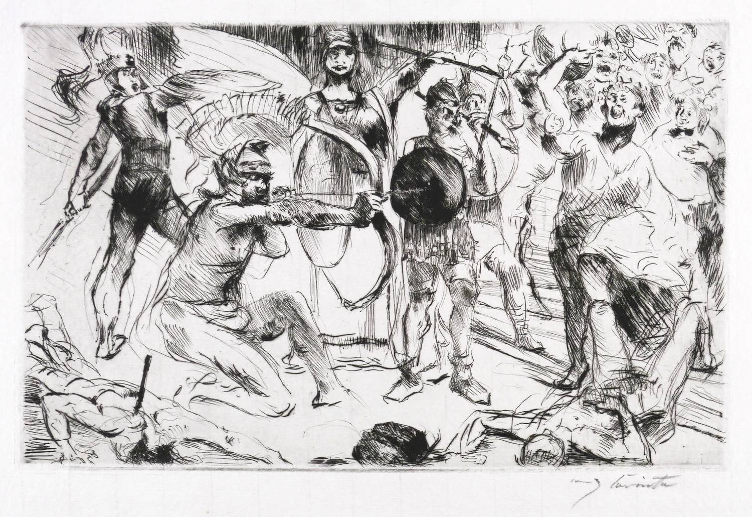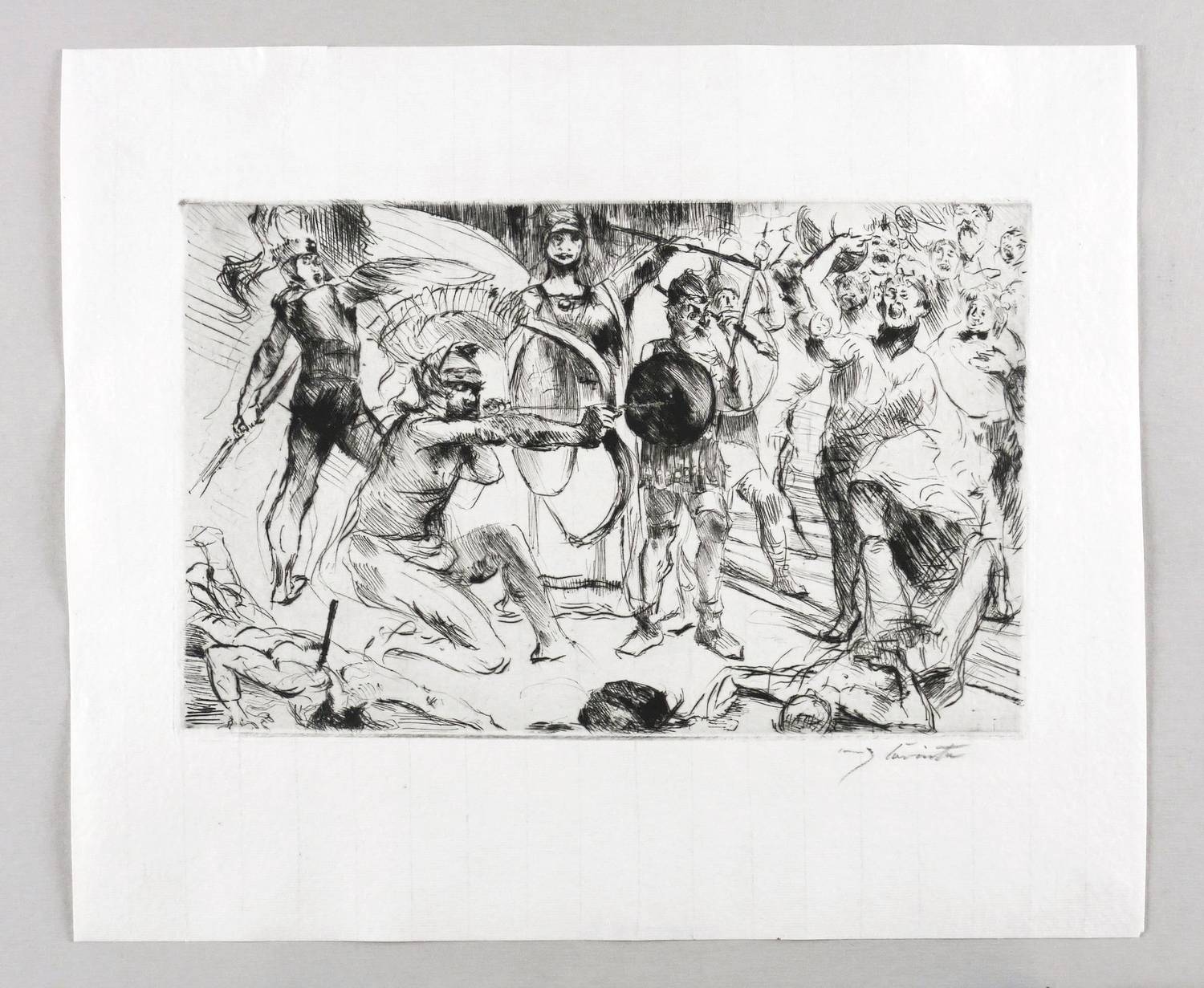 Schwarz 351 I. – Aus: Lovis Corinth, Antike Legenden. 12 Radierungen (Berlin: Marées-Gesellschaft 1919). – Rechts unten in Bleistift signiert: ″Lovis Corinth″. Verso Notationen. – Originalrandiges Exemplar. Sehr guter Zustand.