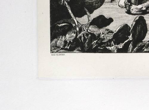 1881. Radierung / Strichätzung, in Schwarz, auf gewalztem China, auf Kupferdruckkarton. – Originale Künstlergrafik, von Max Klinger. – 28,7 x 22,7 cm (Darstellung / Einfassungslinie), 33,7 x 26,7 cm (Platte), 63 x 45 cm (Blatt).