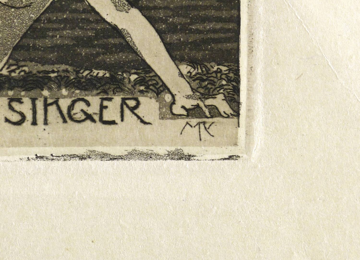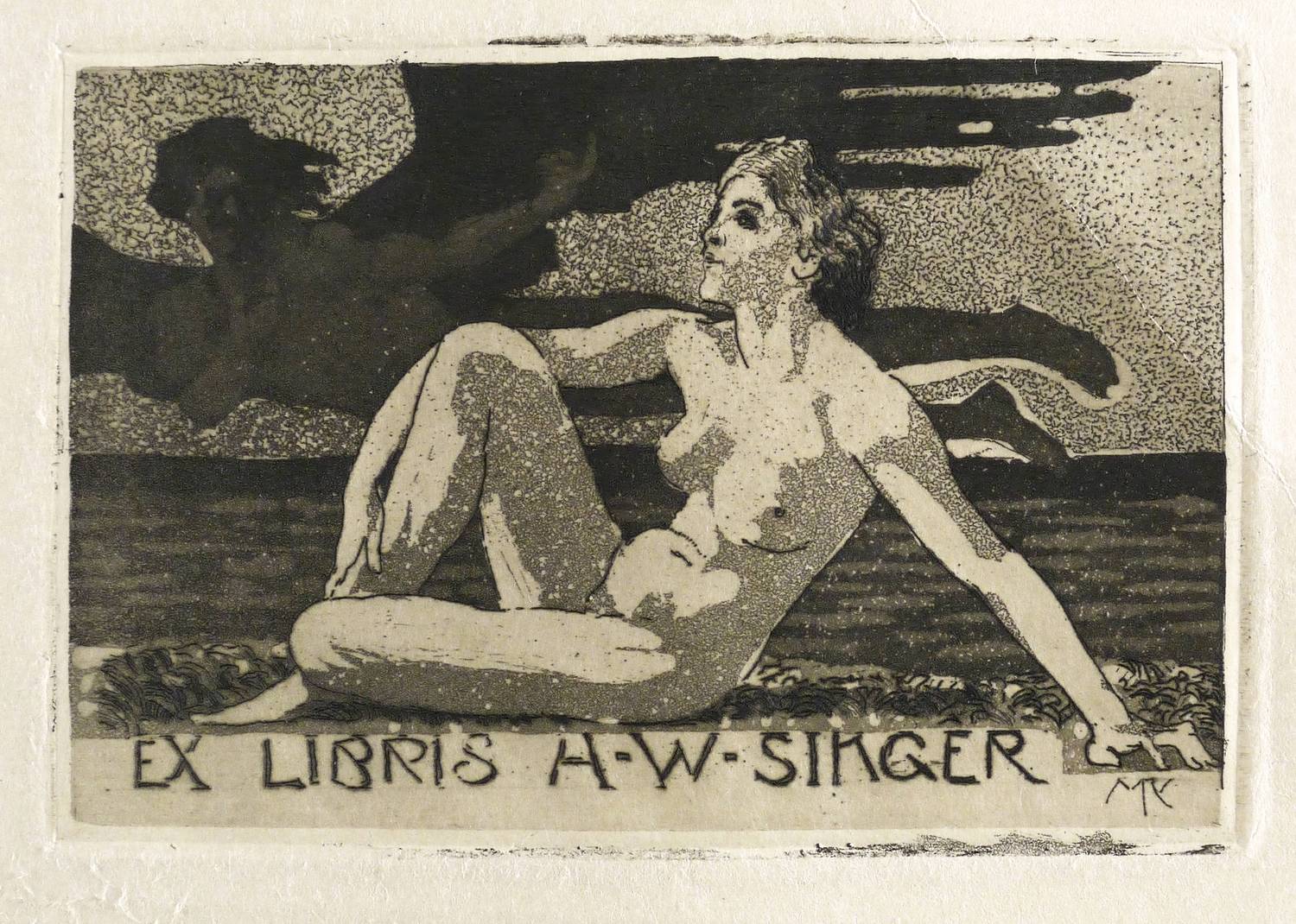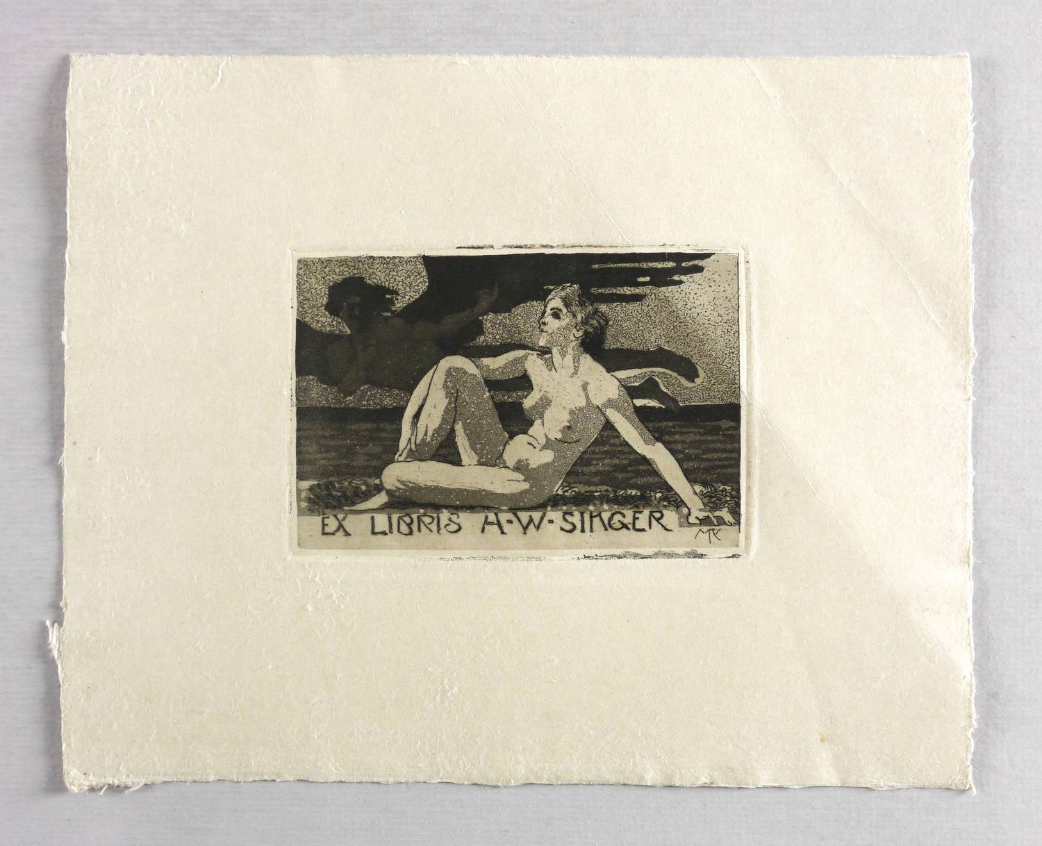 Beyer 407 II (von III). Tauber 28 I. – Nicht handsigniert. In der Platte rechts unten signiert mit Monogramm: ″MK″. Dazu links Inschrift: ″EX LIBRIS H.W. SINGER″. – Eines der schönsten Exlibris-Blätter des Künstlers. - Bei Beyer beschrieben als: ″Nackte weibliche helle Figur mit angezogenem rechten Knie am Meeresstrande sitzend, dahinter nach links schwebend eine geflügelte schwarze Gestalt (Anspielung auf Singers Beruf: Schwarz-weiß-Kunst!).″ – Originalrandiges unbeschnittenes Exemplar. Rechts unten im Blattrand unscheinbares Fleckchen. Insgesamt guter bis sehr guter Zustand.