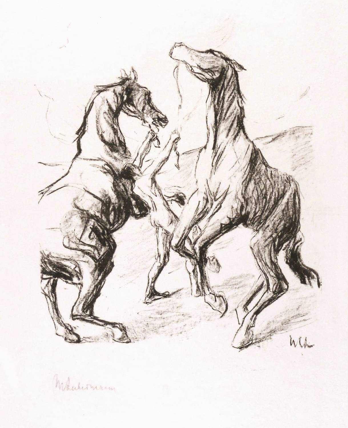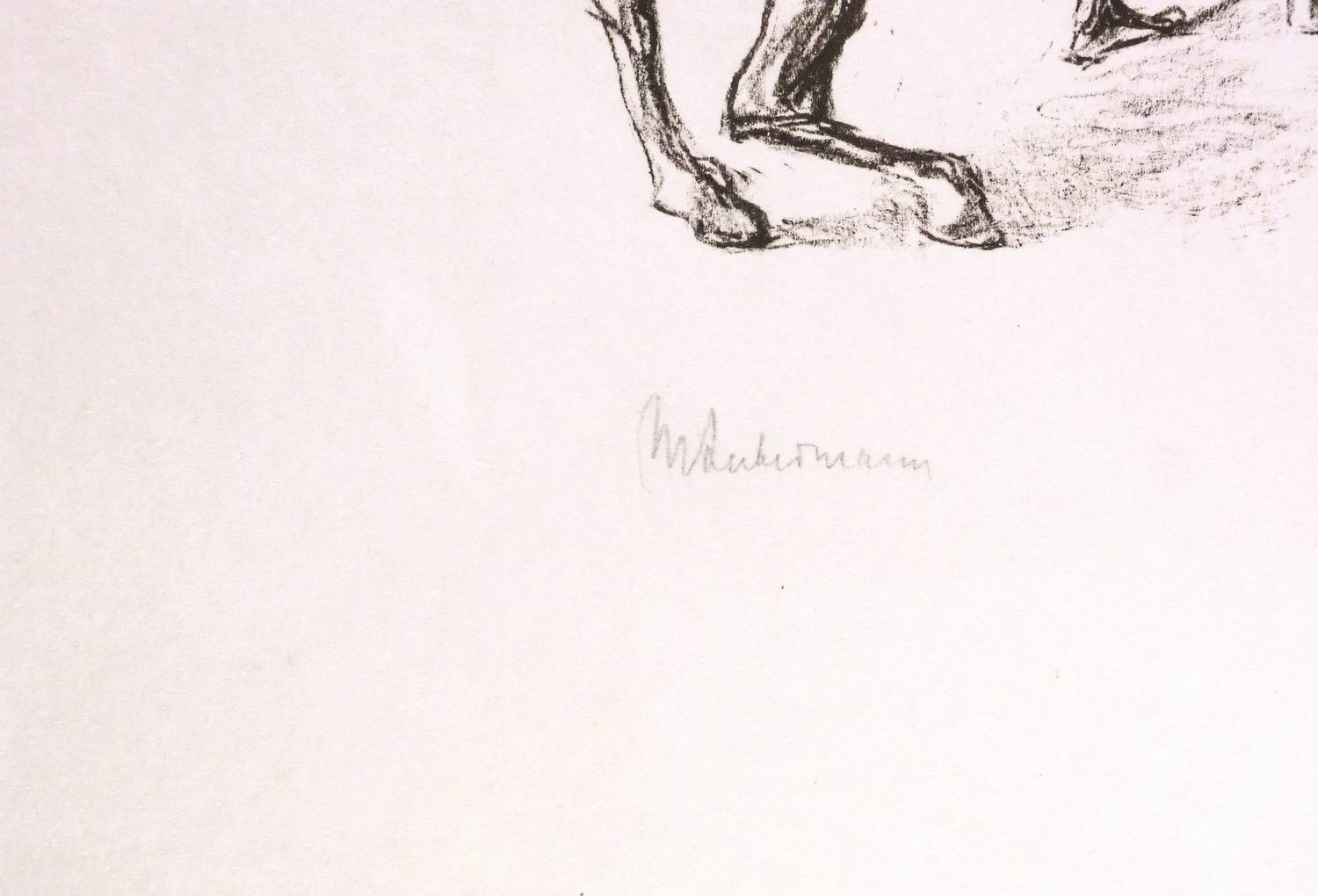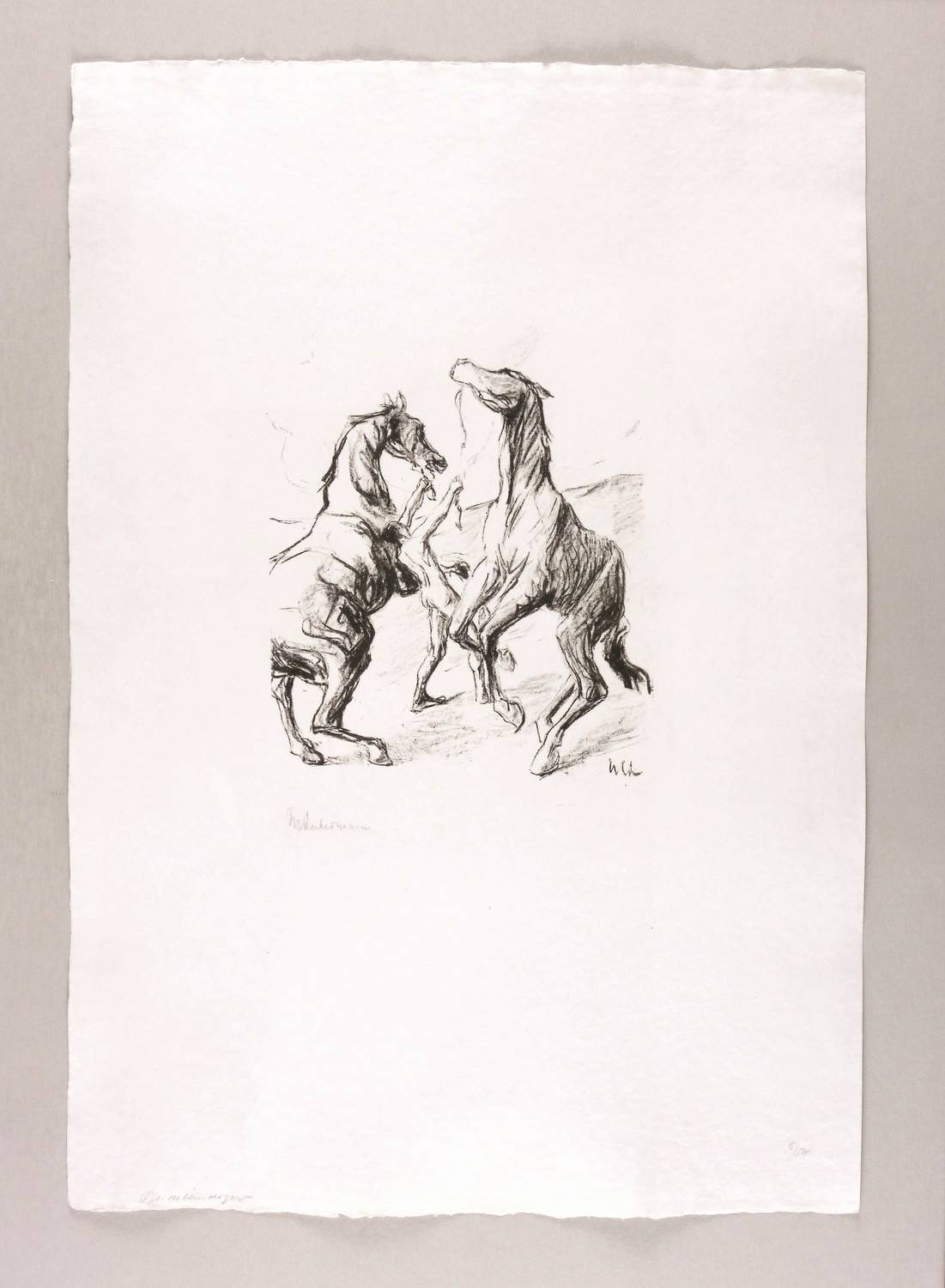 Schiefler 208 b (von b). – Links unten in Bleistift signiert: ″MLiebermann″. In der rechten unteren Blattecke Trockenstempel und Auflagenbezeichnung: ″6/50″. Links im Rand Titel: ″Pferdebändiger″. Im Stein rechts unten nochmals Signatur. – Aus der einzigen Edition von 50 signierten Abzügen bei Bruno Cassirer, Berlin. - Bei Gustav Schiefler beschrieben: ″Zwei einander zugewandt steigende Pferde. Zwischen ihnen (halb von rückwärts gesehen, nach rechts) der Bändiger, nackt, der in den erhobenen Händen die Halfter hält.″ – Schönes originalrandiges Exemplar. Sehr guter Zustand.