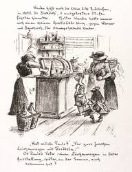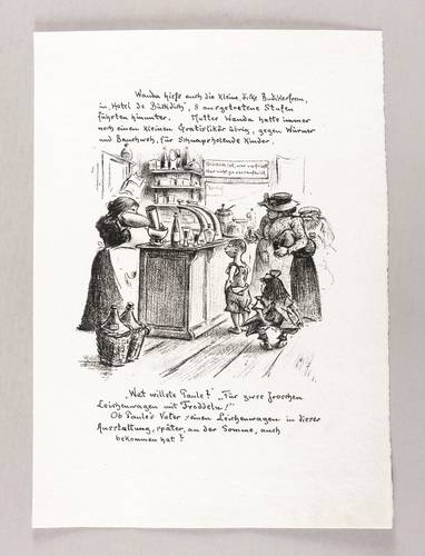 Rosenbach 67 c (von c). – Nicht handsigniert. Im Stein ober- und unterhalb der Darstellung Inschrift: ″Wanda hiess auch die kleine, dicke Budikerfrau, im 'Hotel Bückdich', 8 ausgetretene Stufen führten hinunter. Mutter Wanda hatte immer noch einen kleinen Gratislikör übrig, gegen Würmer und Bauchweh, für Schnapsholende Kinder. / 'Wat willst Paule?' 'Für zwee Jroschen Leichenwagen mit Troddeln!' Ob Paules Vater seinen Leichenwagen in dieser Ausstattung, später an der Somme, auch bekommen hat?″. – Blatt Nr. 9 aus dem Zyklus ″Zwanglose Geschichten und Bilder″. – Papier tadellos erhalten. Sehr guter Zustand.