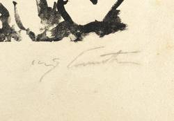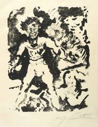 Schwarz L 444 VI. – Aus: Lovis Corinth, Martin Luther (Berlin: Fritz Gurlitt 1920). – Rechts unten in Bleistift signiert: ″Lovis Corinth″. – Im Verlag von Fritz Gurlitt erschienen. Druck der Gurlitt-Presse. Signiert wurden nur die Einzelblätter der ersten 40 Auflagen- Exemplare. - Bei Karl Schwarz beschrieben: ″Der junge Luther steht breitgrätschig in Frontalstellung da und breitet die Arme aus. Er steht mit entsetztem Gesicht inmitten eines Unwetters von Hagelschlag.″ (WVZ Schwarz, S. 244). – Originaler breiter Rand. papier altersgemäß etwas gegilbt. Signatur im rechten Bereich etwas gewischt. Mäßig guter Zustand.
