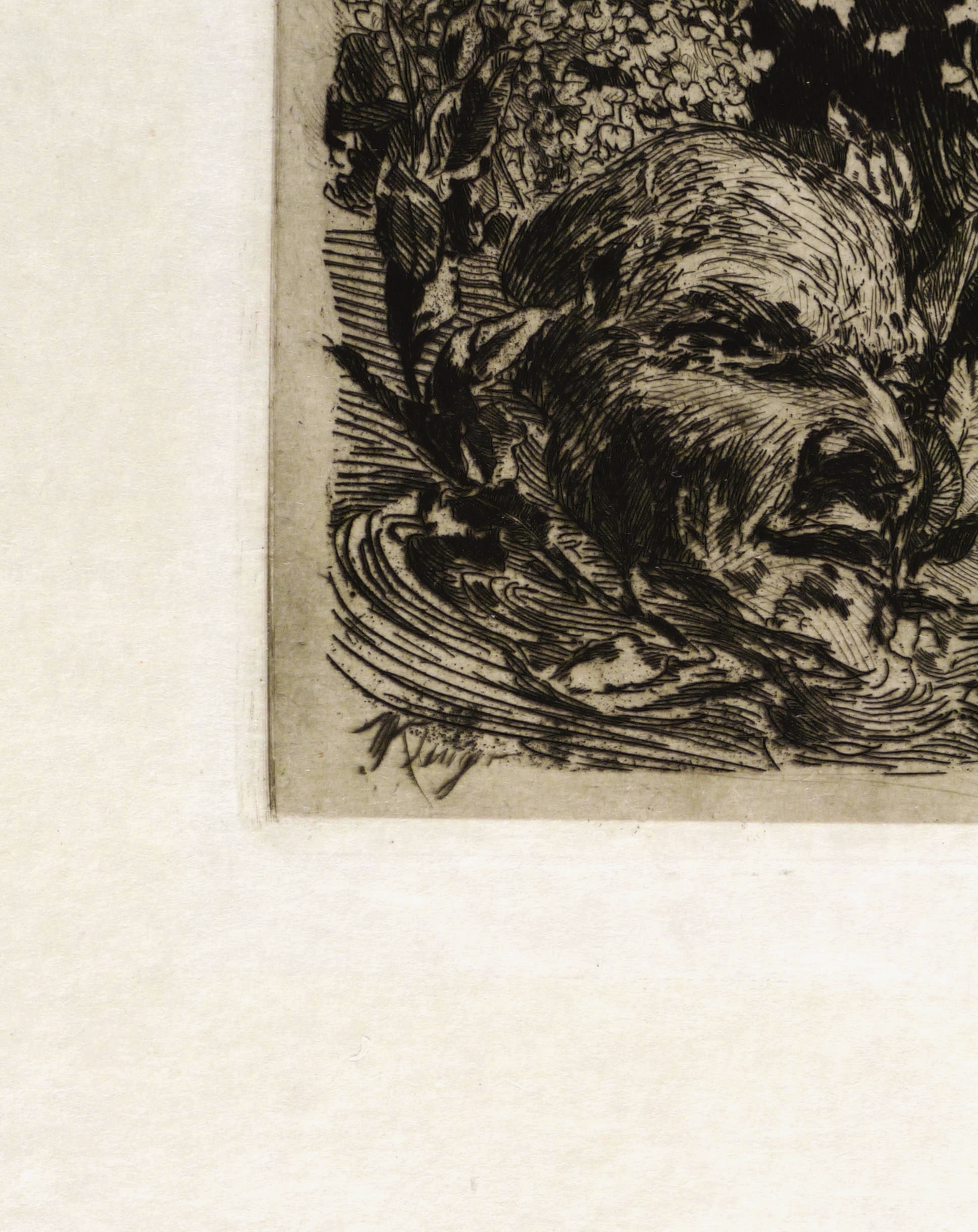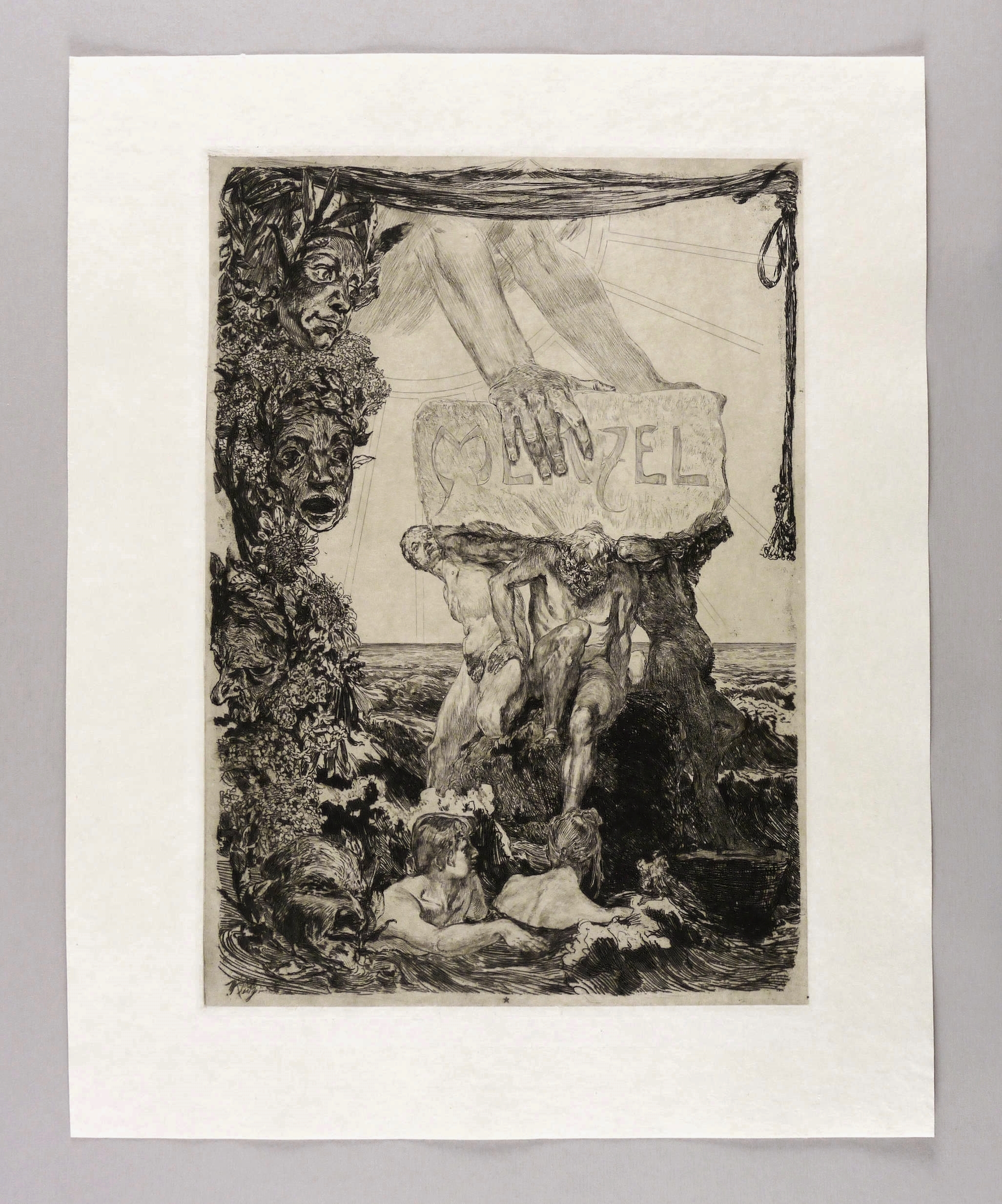 Singer 268 IV (von IV). – In der Platte links unten in der Darstellung gestochene Signatur: ″M Klinger″. Mittig Pentagramm. Auf dem Felsblock im Zentrum der Darstellung Inschrift: ″MENZEL″. – Druck der 1852 gegründeten Druckerei Giesecke & Devrient in Leipzig, in der Klinger zahlreiche seiner Radierungen drucken ließ. – Erschienen zur Ehrenfeier für Adolph von Menzel am 5. April 1884 des Vereins Berliner Künstler. – Blattrücken im linken Rand mit kaum merklichen Montagespuren. Keine Mängel. Sehr guter Zustand.