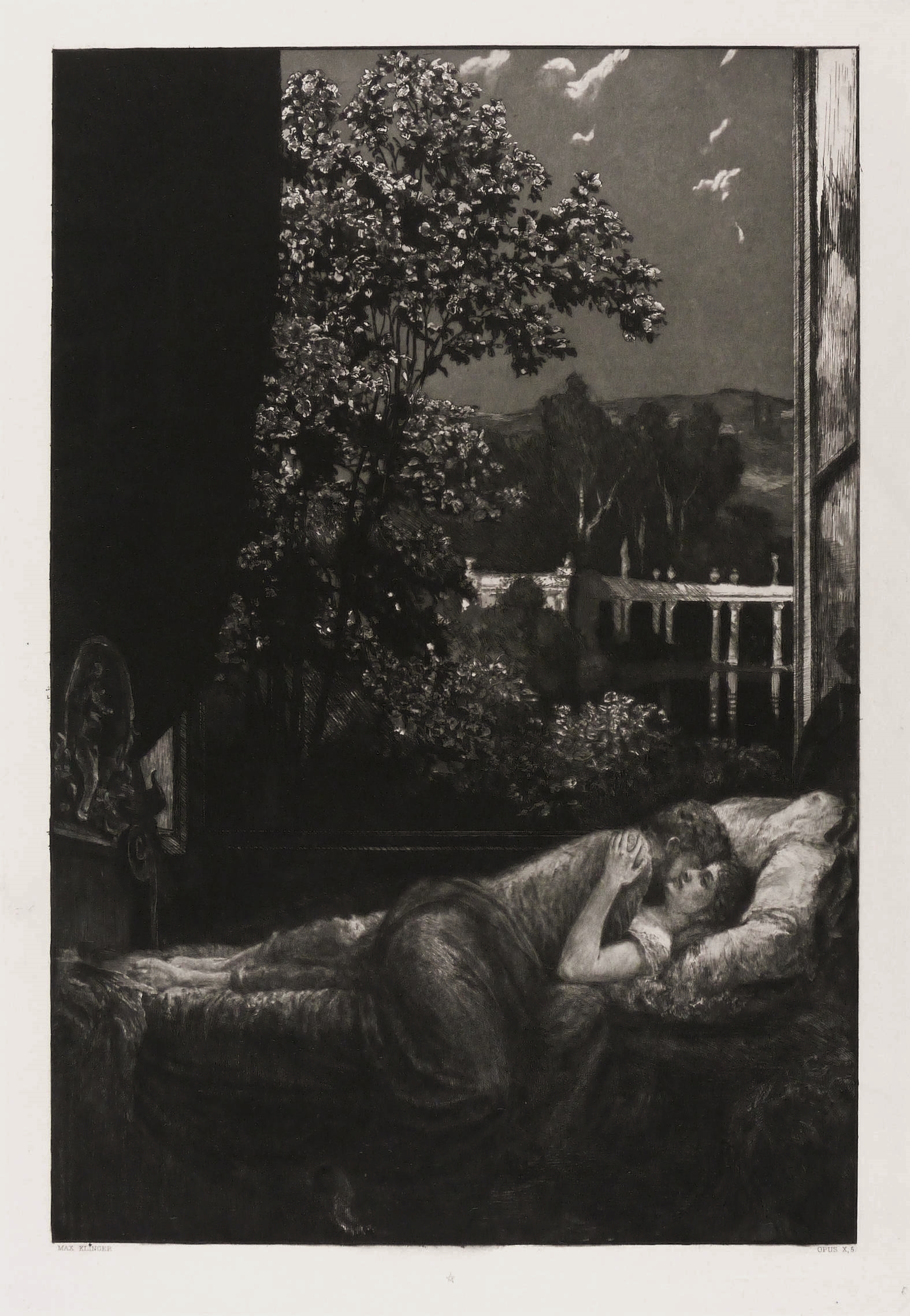 Singer 161 IX. – In der Platte links unten gestochene Signatur: ″MAX KLINGER″. Mittig gestochenes Pentagramm. Rechts bezeichnet: ″OPUS X, 5″. – Originalrandiges unbeschnittenes Exemplar. Sehr schön erhalten. Sehr guter Zustand.