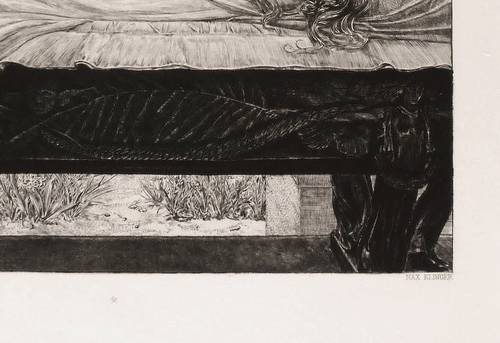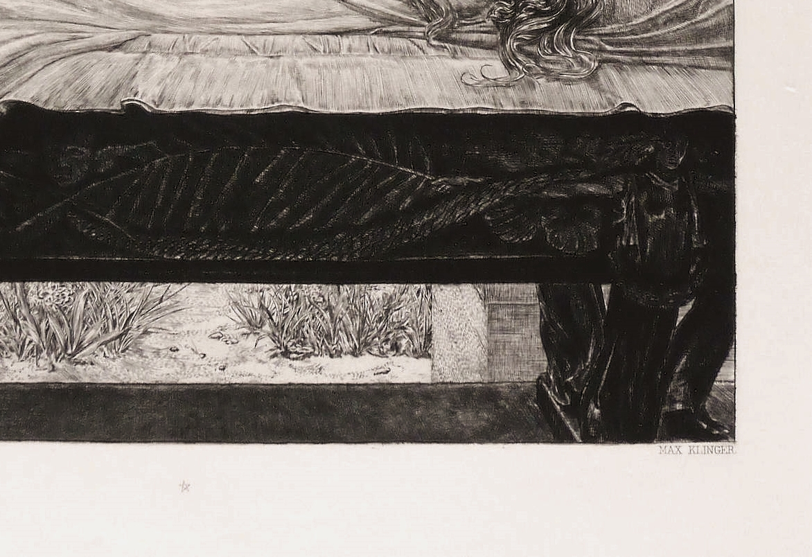 Singer 239 V (von VI). – In der Platte rechts unten gestochene Signatur: ″MAX KLINGER″. Mittig gestochenes Pentagramm. Links Druckeradresse: ″O. FELSING, BERLIN IMPR.″ In der Darstellung links unten radiertes Monogramm und Jahr: ″MK 89″. – Singer hebt diese Radierung in seinem Werkverzeichnis als druckgrafisches Hauptwerk besonders hervor: ″Das als Auffassung und in der Komposition unvergleichliche Blatt ist wohl das schönste, das Klinger je geschaffen hat.″ (Hans Wolfgang Singer, Max Klinger's Radierungen, Stiche und Steindrucke. Wissenschaftliches Verzeichnis, Berlin: Amsler und Ruthardt 1909, S. 93). – Originalrandiges unbeschnittenes Exemplar. Ohne Mängel. Sehr guter Zustand.