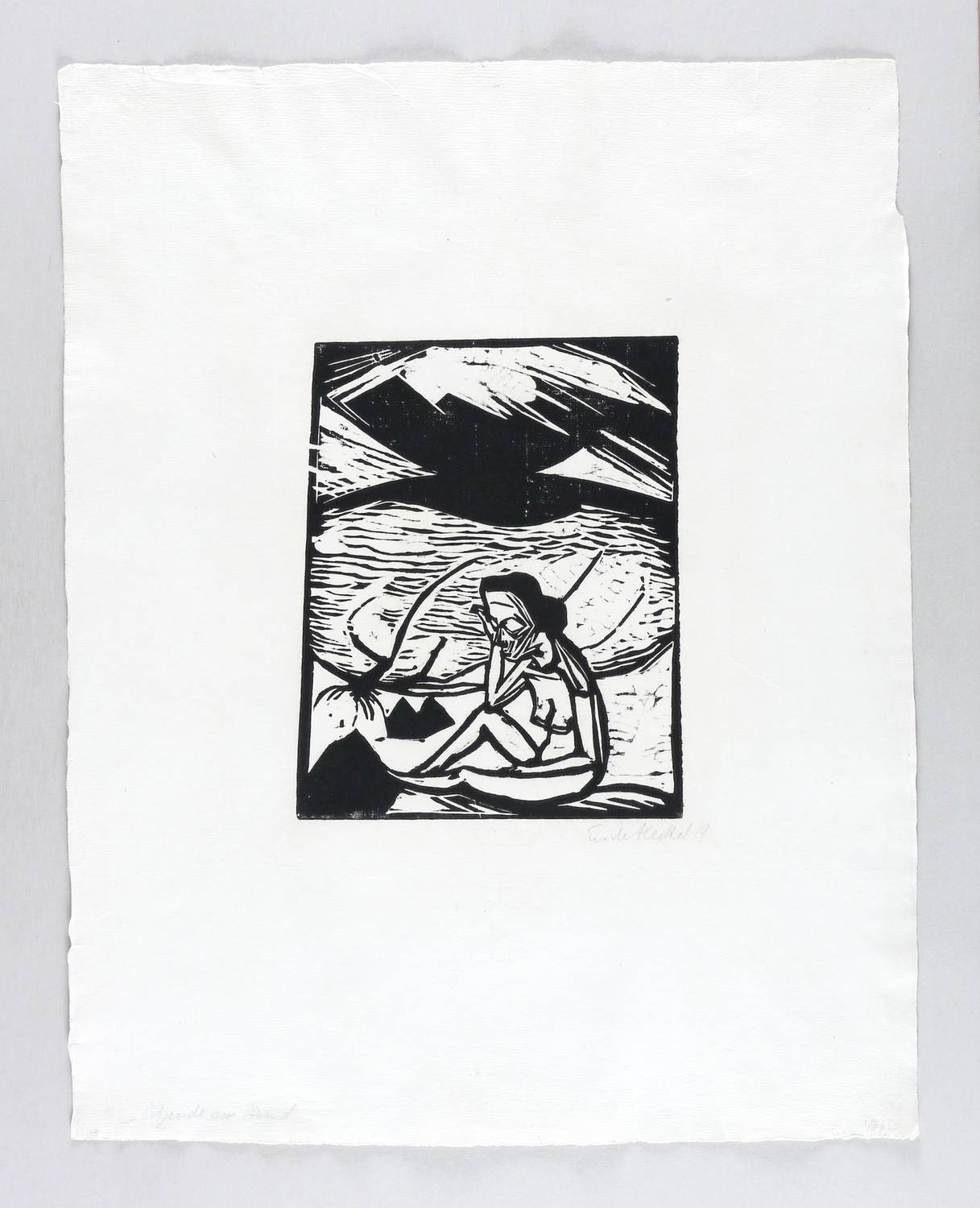 Dube L 321. – Rechts unten in Bleistift signiert und datiert: ″Erich Heckel 19″. In der Blattecke links unten eigenhändig Titel: ″Sitzende am Strand″. Wasserzeichen der Papiermühle. – Selten. – Tadellos erhalten. Großes unbeschnittenes Blatt. Sehr guter Zustand.