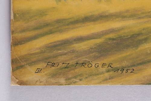 Links unten in Feder und Tusche signiert und datiert: ″FRITZ TRÖGER III. 1952″. Verso in Bleistift eigenes Qualitätssigel: ″XXX″. – Im Rand zahlreiche Knickspuren und Risse restauriert. Mäßig guter Zustand.