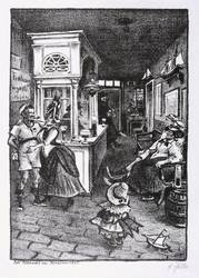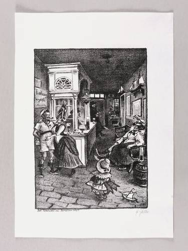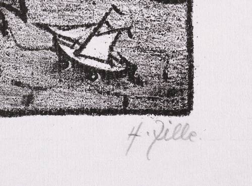 Rosenbach 75 b (von c). – Rechts unten in Bleistift signiert: ″H. Zille.″ Im Stein links unten bezeichnet: ″Bei Tübbecke in Stralow 1875.″ Angeschnittenes Wasserzeichen von J.W. Zanders. – Blatt Nr. 17 aus dem bekannten Lithografie- Zyklus ″Zwanglose Geschichten und Bilder″. – Tadellos erhalten. Sehr guter Zustand.
