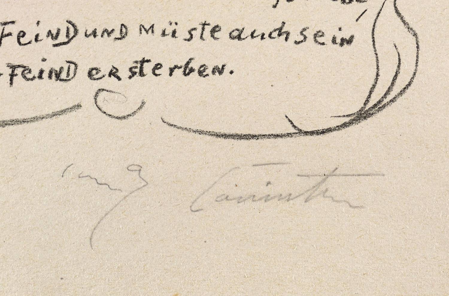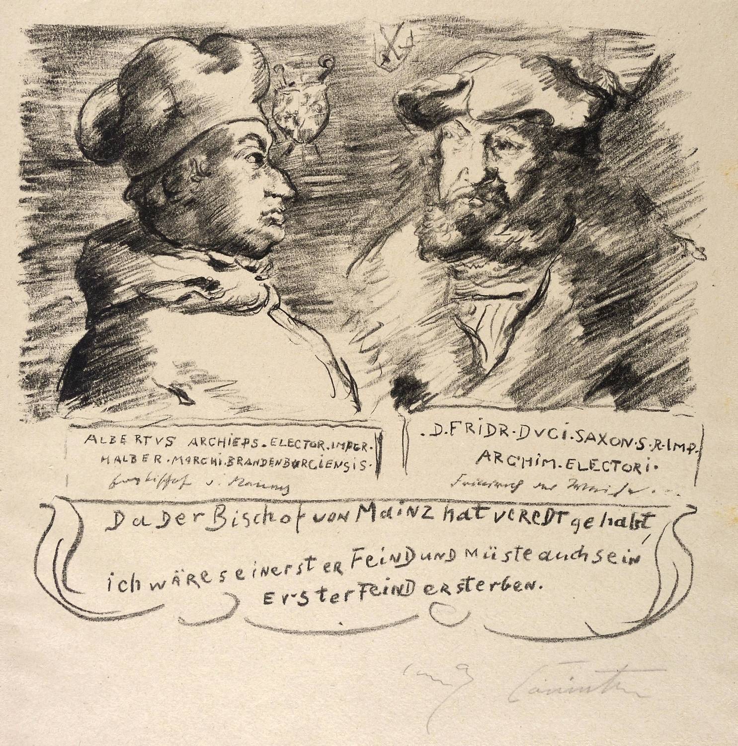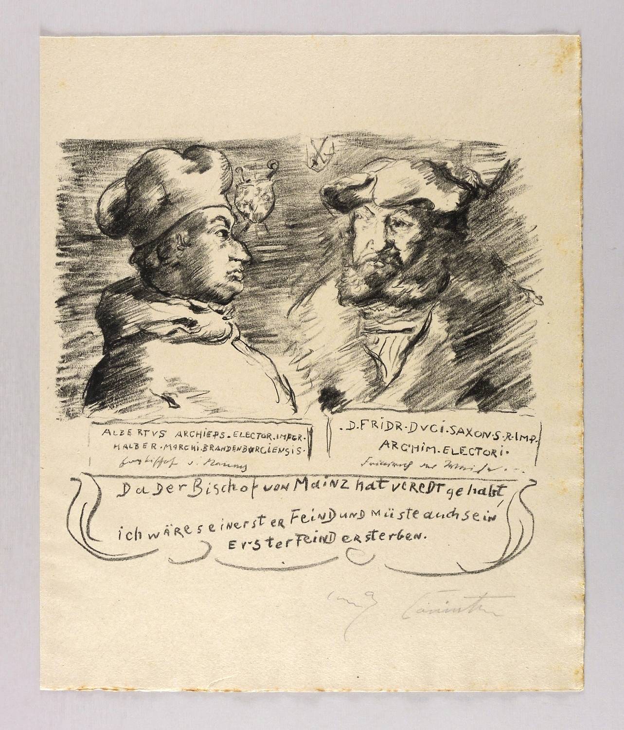 Schwarz L 399 XI. – Aus: Lovis Corinth, Das Leben des Götz von Berlichingen, von ihm selbst erzählt (Berlin: Fritz Gurlitt 1919). – Rechts unten in Bleistift signiert: ″Lovis Corinth″. – Originalgrafisches Blatt aus ″Das Leben des Götz von Berlichingen, von ihm selbst erzählt″, im Verlag von Fritz Gurlitt 1919 erschienen. Druck der Gurlitt-Presse. Signiert wurden nur die Einzelblätter der ersten 40 Auflagen-Exemplare. - Bei Karl Schwarz beschrieben: ″Die Bildnisse des Erzbischofs von Mainz und Friedrichs des Weisen nach Albrecht Dürers Kupferstichen.″ (WVZ Schwarz, S. 212/213). – Originalrandiges Exemplar. Kleiner Riss im unteren Rand. Mäßig guter Zustand.