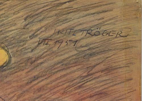 1951. Mischtechnik / Kreide & Aquarell, auf orange-braunem Karton. – Originale Künstlergrafik, von Fritz Tröger. – Unikat. – 73,2 x 51,8 cm (Darstellung / Blatt).