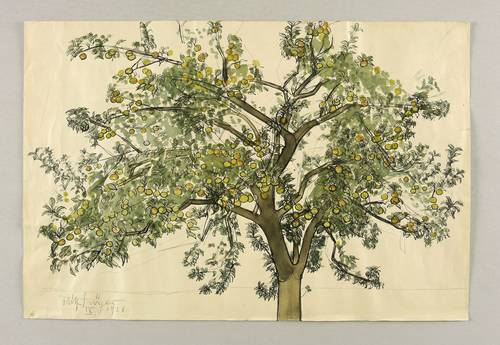 Links unten in schwarzer Feder signiert und datiert: ″Fritz Tröger IX. 1928″. Verso in Bleistift Qualitätssigel: ″XXXO″. Dazu in schwarzer Feder bezeichnet: ″Apfelbaum″. – Minimale Lagerspuren. Guter Zustand.