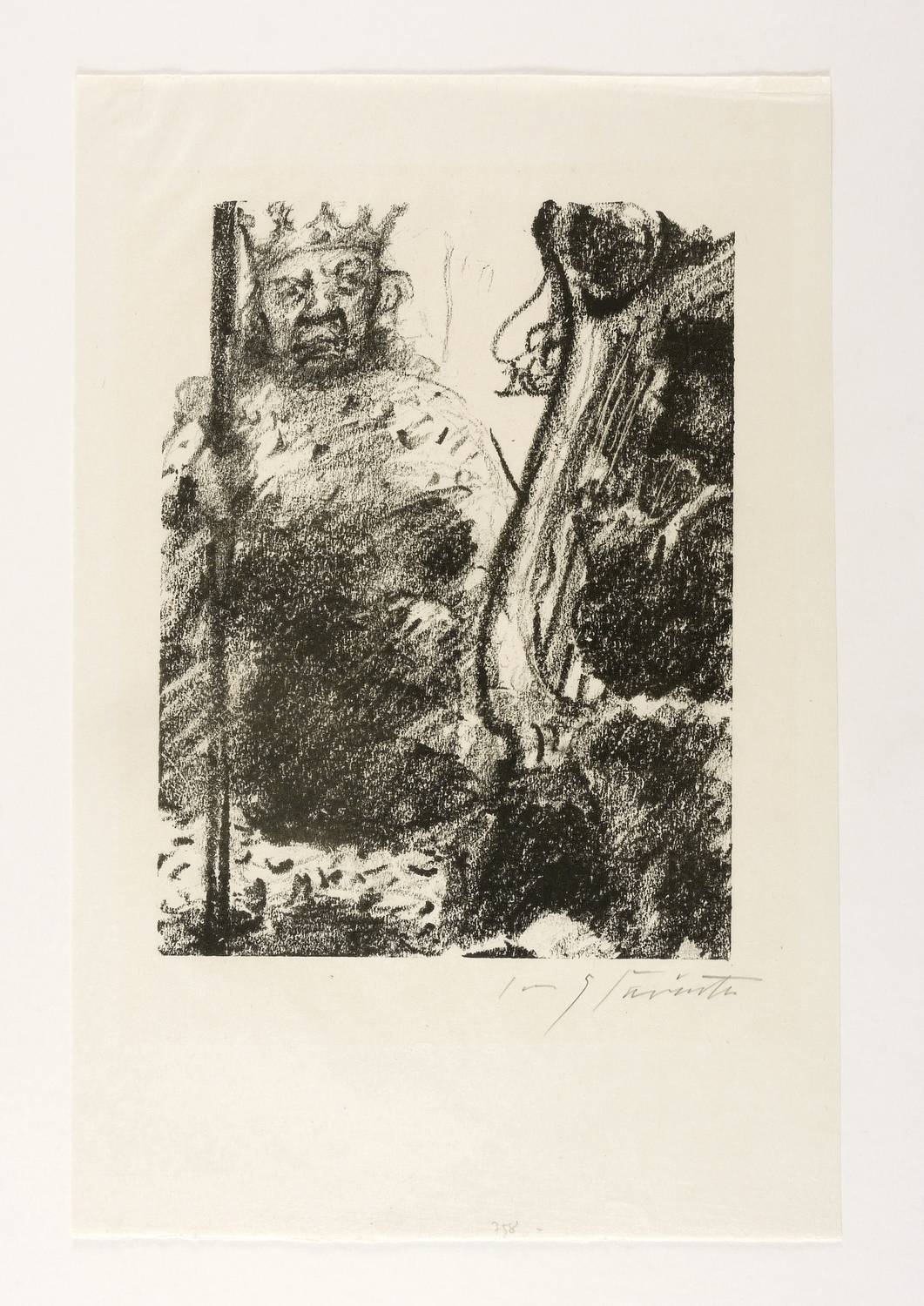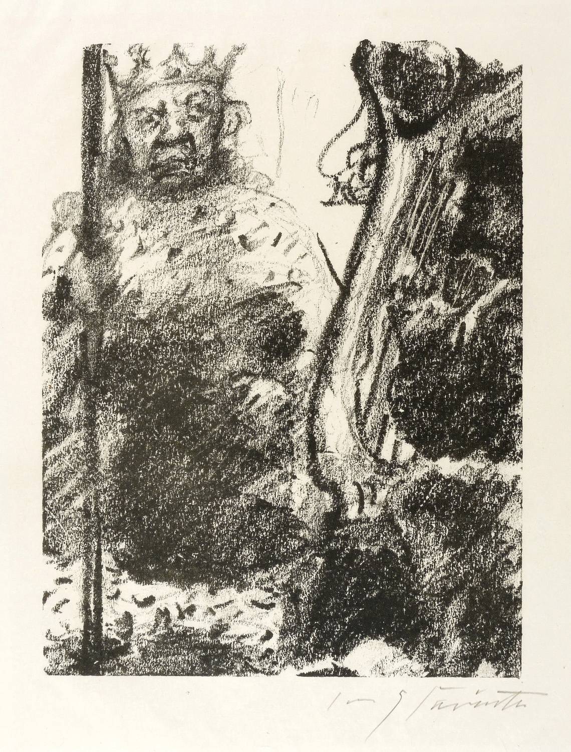 Müller 758. – Aus: Lovis Corinth, Saul und David (Berlin: Propyläen Verlag 1923). – Rechts unten in Bleistift signiert: ″Lovis Corinth″. – Aus der Blatt für Blatt signierten Auflage von 25 auf Japan abgezogenen Exemplaren. – Im oberen Blattrand Reste von Papiergelenken. Sehr guter Zustand.