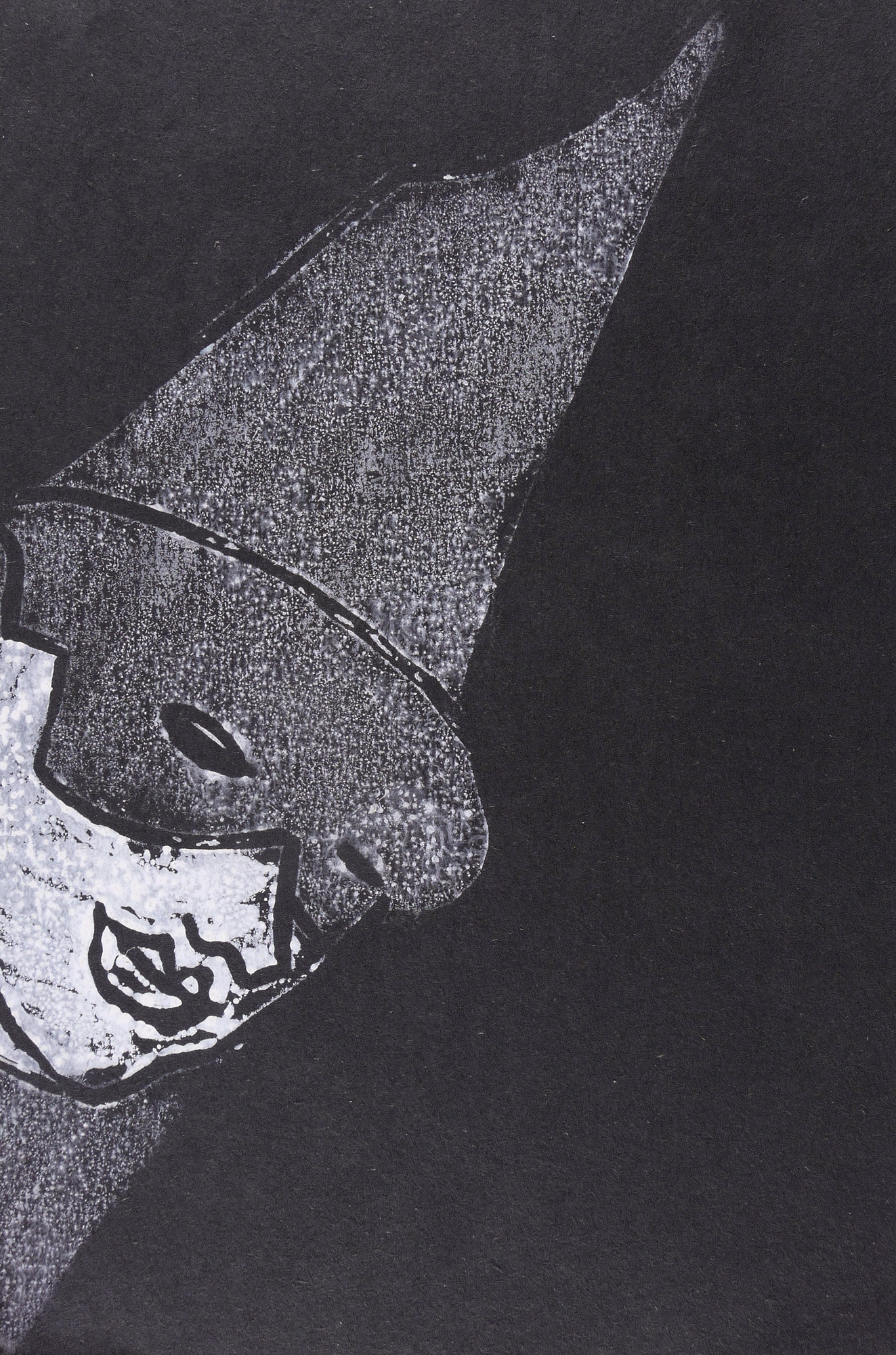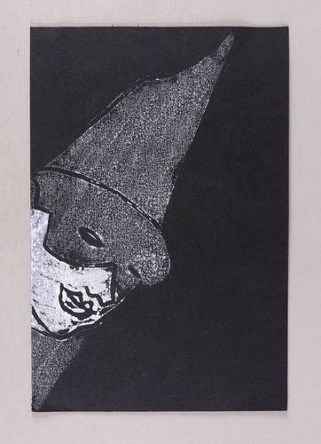 1983. Farblinolschnitt, in Grau & Weiß, auf schwarz getöntem Velinkarton. – Originale Künstlergrafik, von Helmut Gebhardt. – 26,3 x 17,6 cm (Darstellung / Blatt).