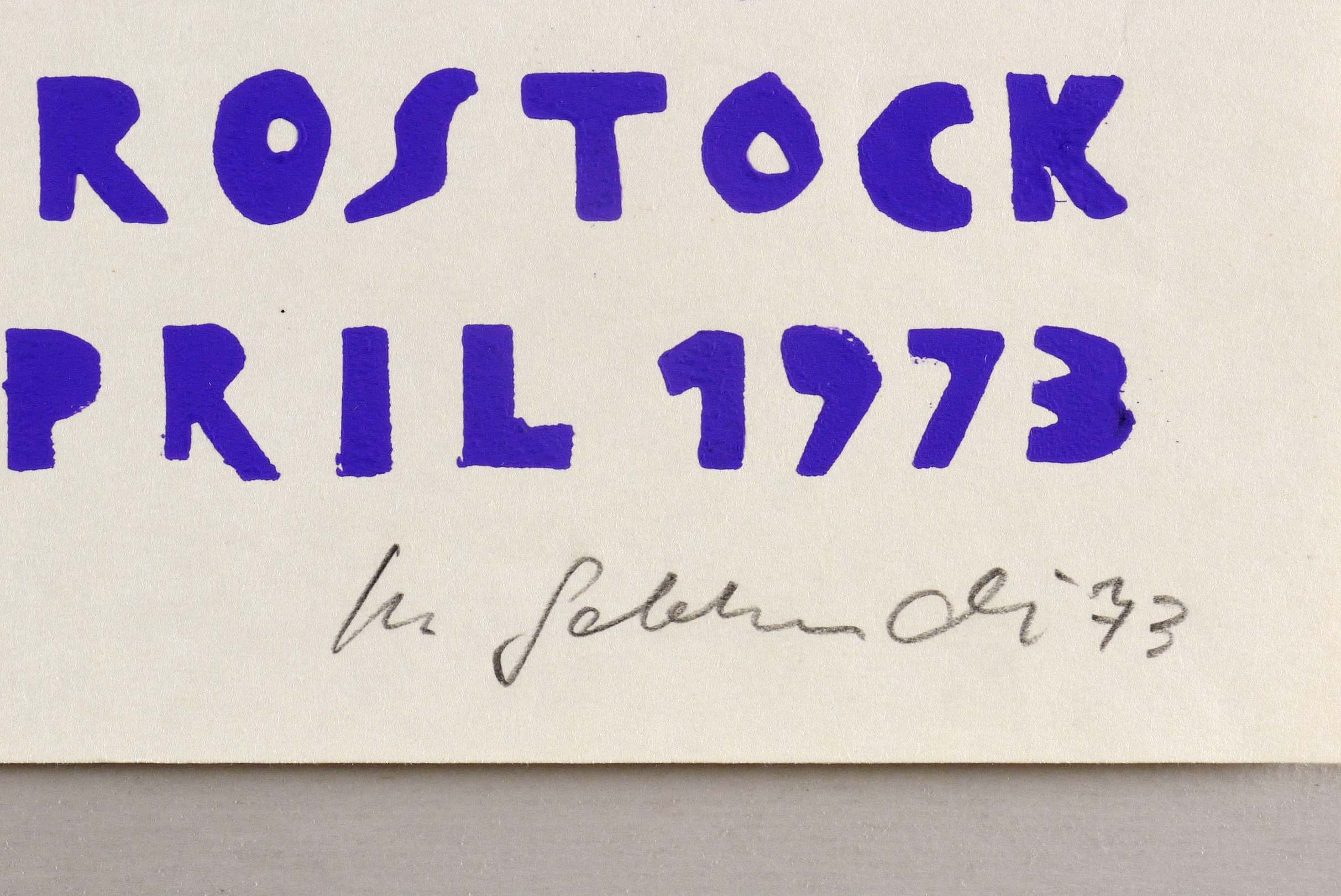 Rechts unten in Bleistift signiert und datiert: ″H. Gebhardt '73″. Links bezeichnet: ″Handdruck″. – Originales Künstlerplakat zur Ausstellung ″Helmut Gebhardt″ April 1973 im Café der Kunsthalle Rostock. – Sehr guter Zustand.