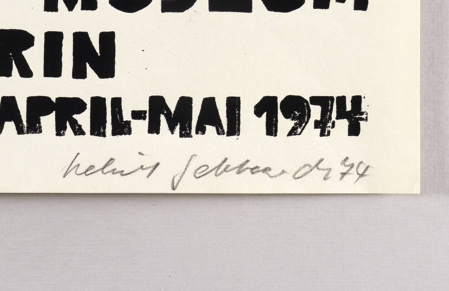 Rechts unten in Bleistift signiert und datiert: ″H. Gebhardt 74″. Links bezeichnet: ″Handdruck″. – Originales Künstlerplakat zur Ausstellung ″Helmut Gebhardt Dresden. Druckgrafik″ April-Mai 1974 in der Kleinen Ladengalerie des Staatlichen Museums Schwerin. – Sehr guter Zustand.