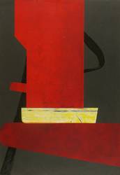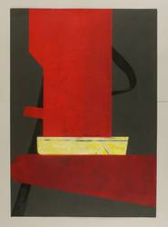 1987. Farblinolschnitt, in Rot, Gelb & Schwarz, auf schwarz getöntem Karton. – Originale Künstlergrafik, von Helmut Gebhardt. – Auflage Exemplar Nr. 1/20. – 100,5 x 70,5 cm (Darstellung / Blatt).