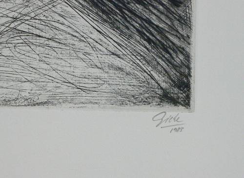 1983. Radierung / Kaltnadel, in Schwarz, auf hellchamois Velin. – Originale Künstlergrafik, von Hubertus Giebe. – Künstlerexemplar (e.a.). – 49,5 x 64,0 cm (Darstellung / Platte), 70 x 86 cm (Blatt).