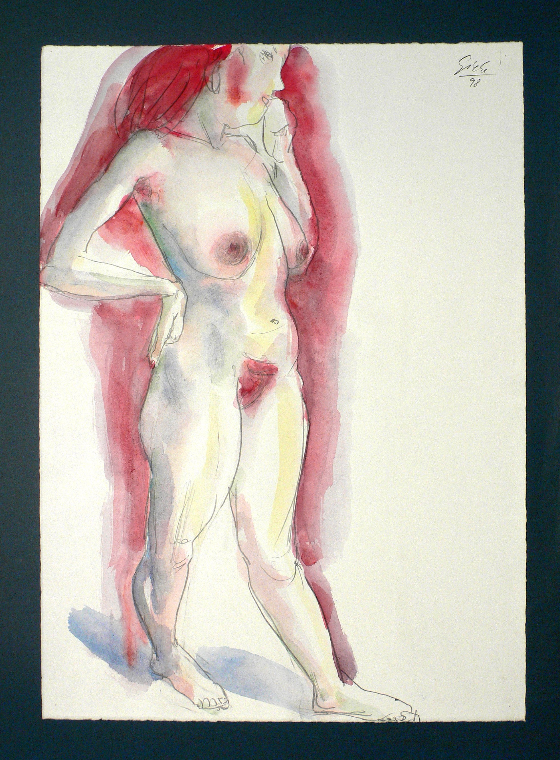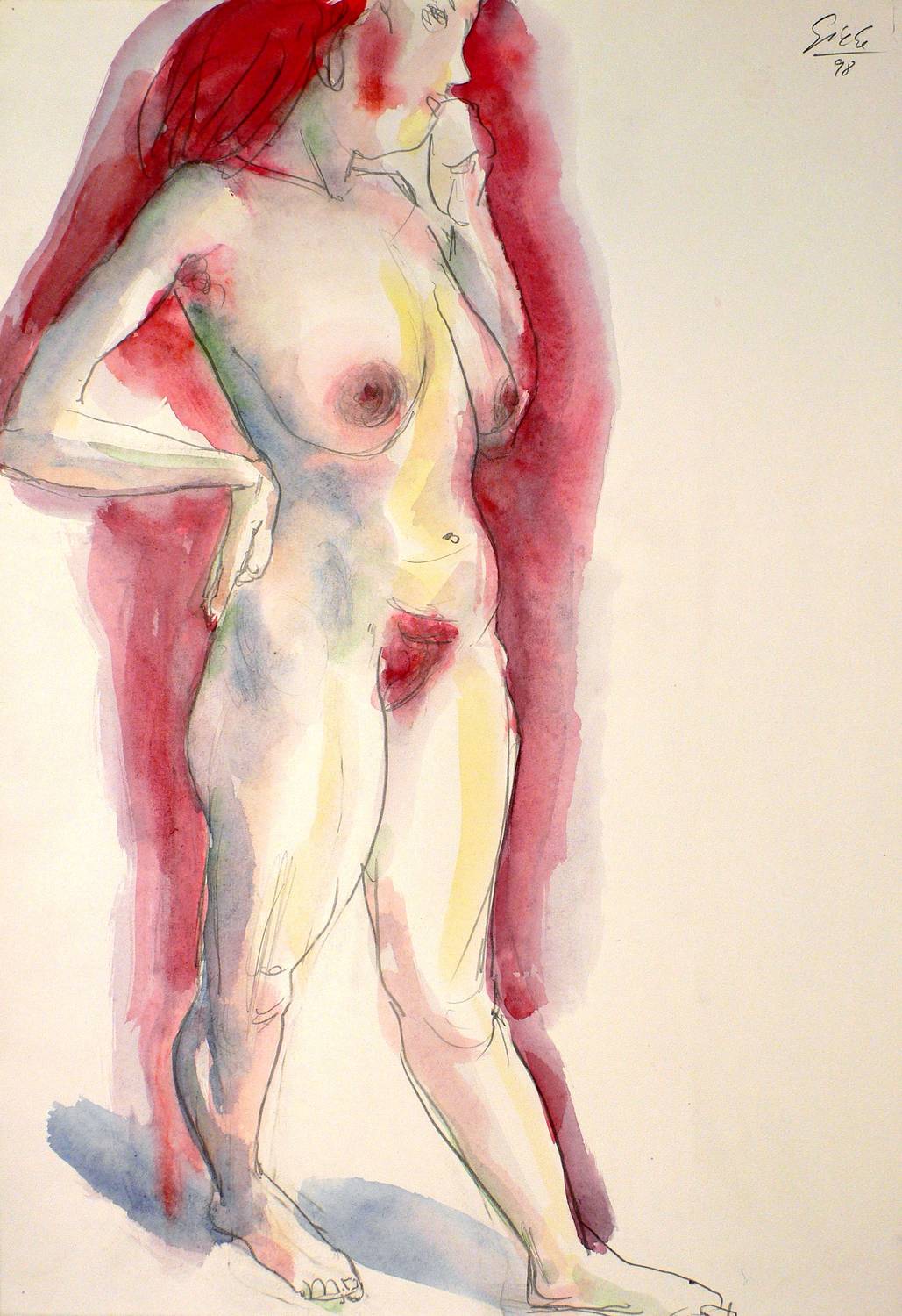 1998. Aquarell, über Bleistift, auf hellchamois Bütten. – Originale Künstlergrafik, von Hubertus Giebe. – Unikat. – 59,0 x 42,0 cm (Darstellung / Einfassungslinie).