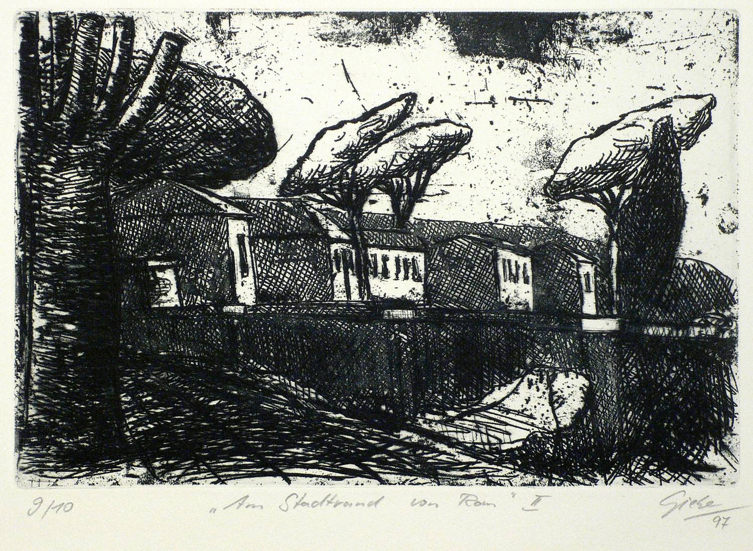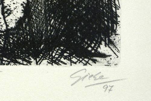 1997. Radierung / Strichätzung, in Schwarz, auf hellgrau getöntem Bütten. – Originale Künstlergrafik, von Hubertus Giebe. – Auflage Exemplar Nr. 9/10. – 21,0 x 31,9 cm (Darstellung / Platte), 40 x 54 cm (Blatt).