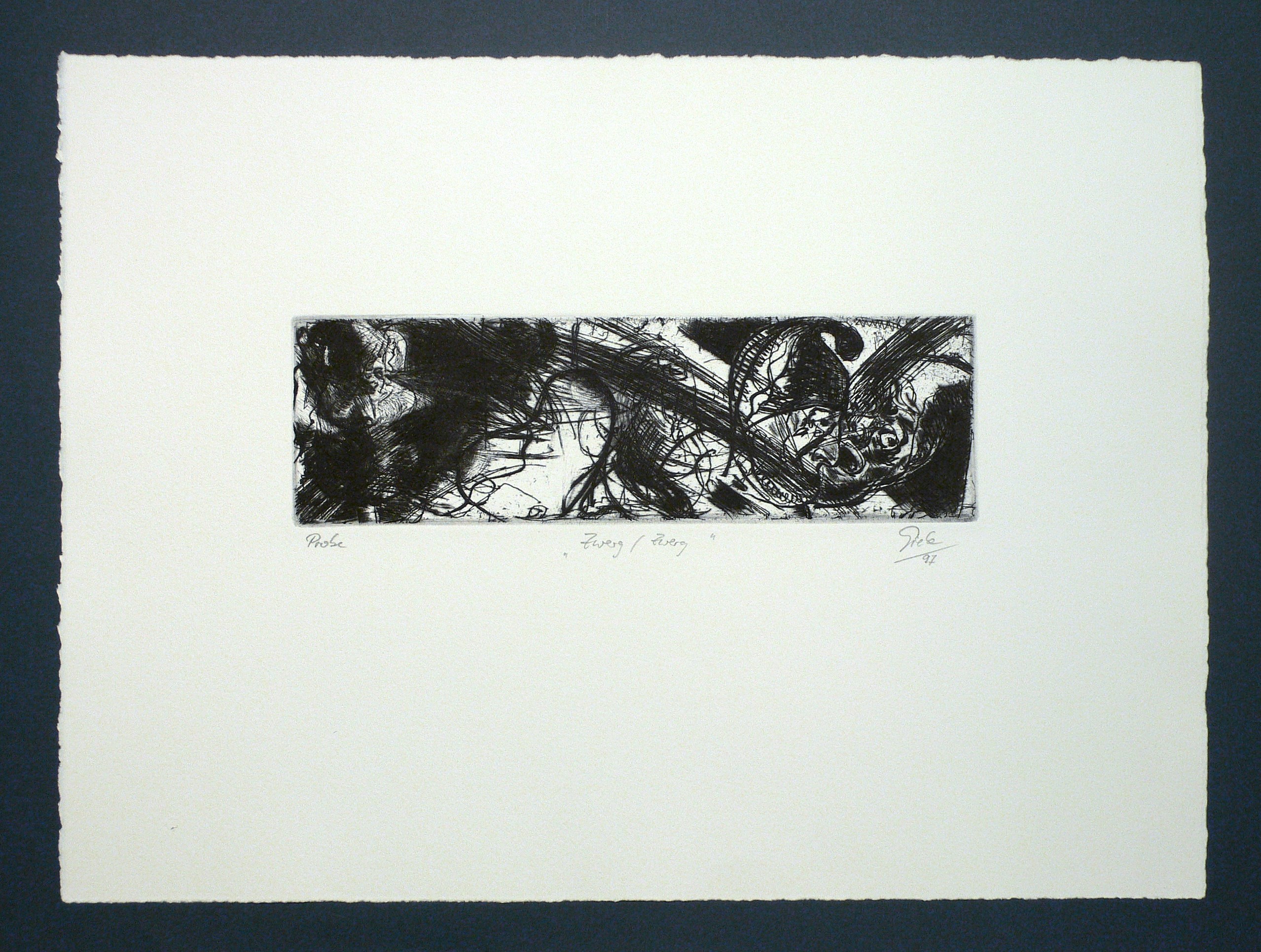 1997. Radierung / Strichätzung, auf hellgrauem Büttenpapier. – Originale Künstlergrafik, von Hubertus Giebe. – Probedruck. – 9,9 x 32,0 cm (Darstellung / Platte), 39,5 x 54 cm (Blatt).
