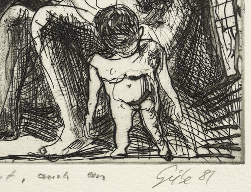 1981. Radierung / Strichätzung, in Schwarz, auf hellchamois Velin. – Originale Künstlergrafik, von Hubertus Giebe. – Auflage Exemplar Nr. 17/50. – 19,2 x 24,5 cm (Darstellung / Platte), 23 x 30 cm (Blatt).