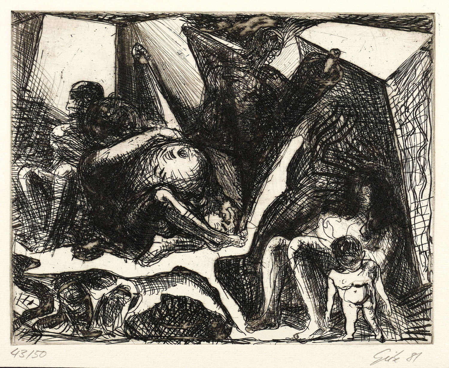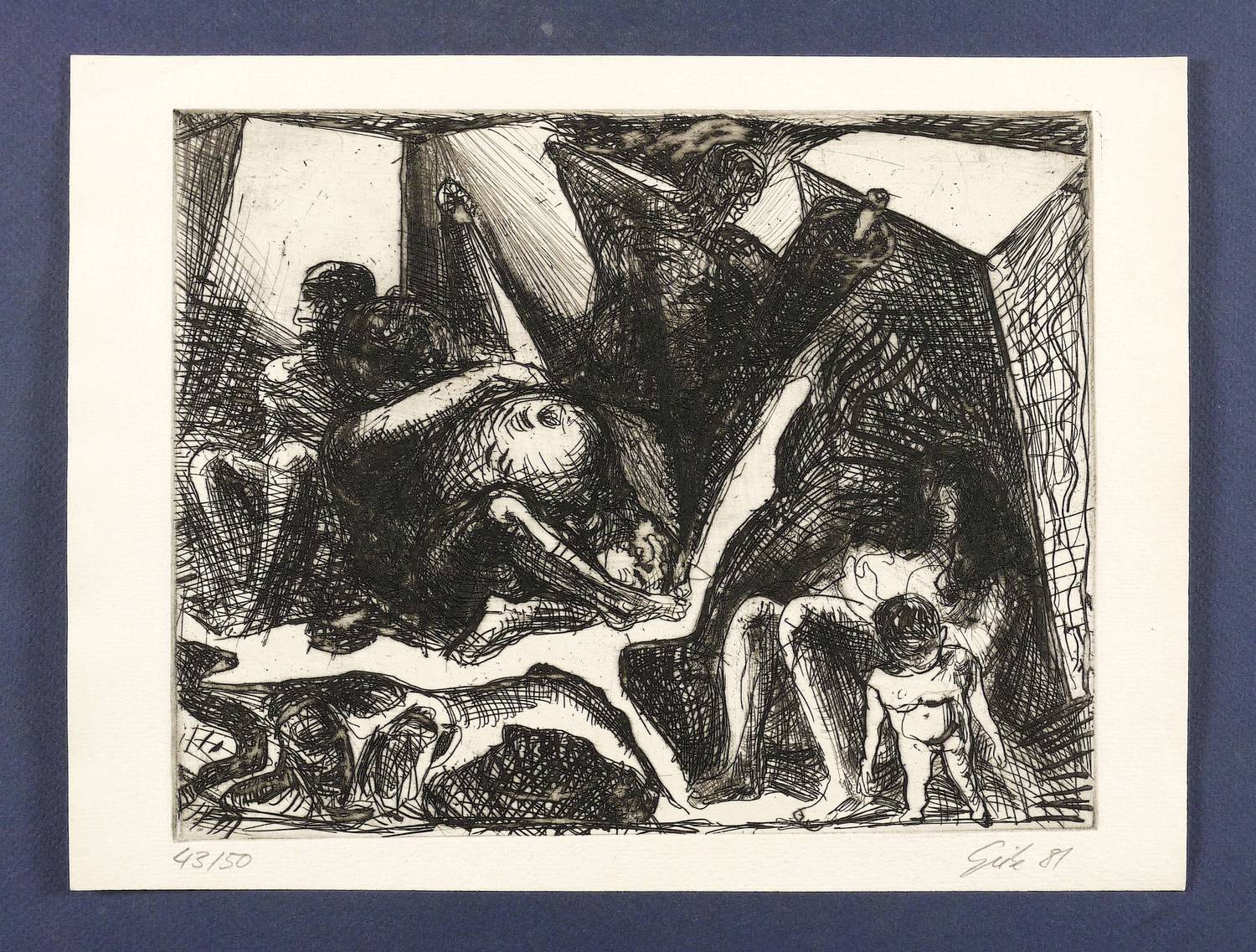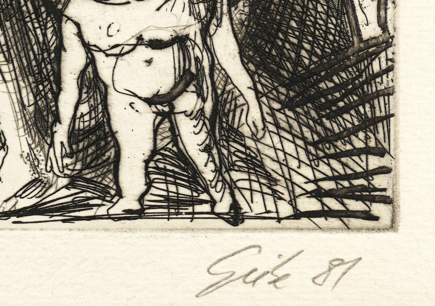 1981. Radierung / Strichätzung, auf Weißenborn-Bütten. – Originale Künstlergrafik, von Hubertus Giebe. – Auflage Exemplar Nr. 43/50. – 19,3 x 24,5 cm (Darstellung / Platte), 22 x 29,5 cm (Blatt).