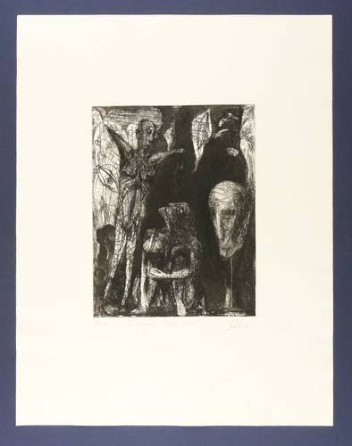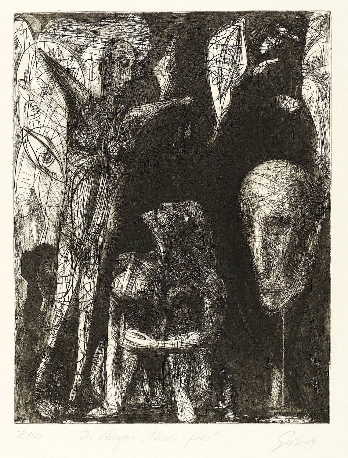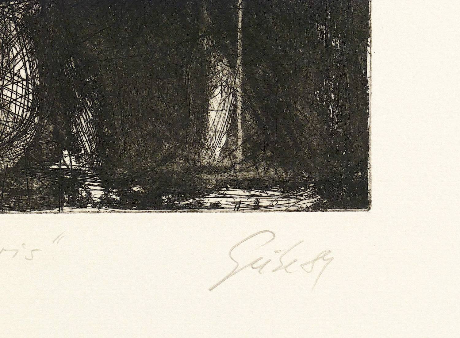 1981. Radierung / Aquatinta & Strichätzung, in Schwarz, auf hellgelbem Papier. – Originale Künstlergrafik, von Hubertus Giebe. – Auflage Exemplar Nr. 2/50. – 33,4 x 25,6 cm (Darstellung / Platte), 65 x 50 cm (Blatt).