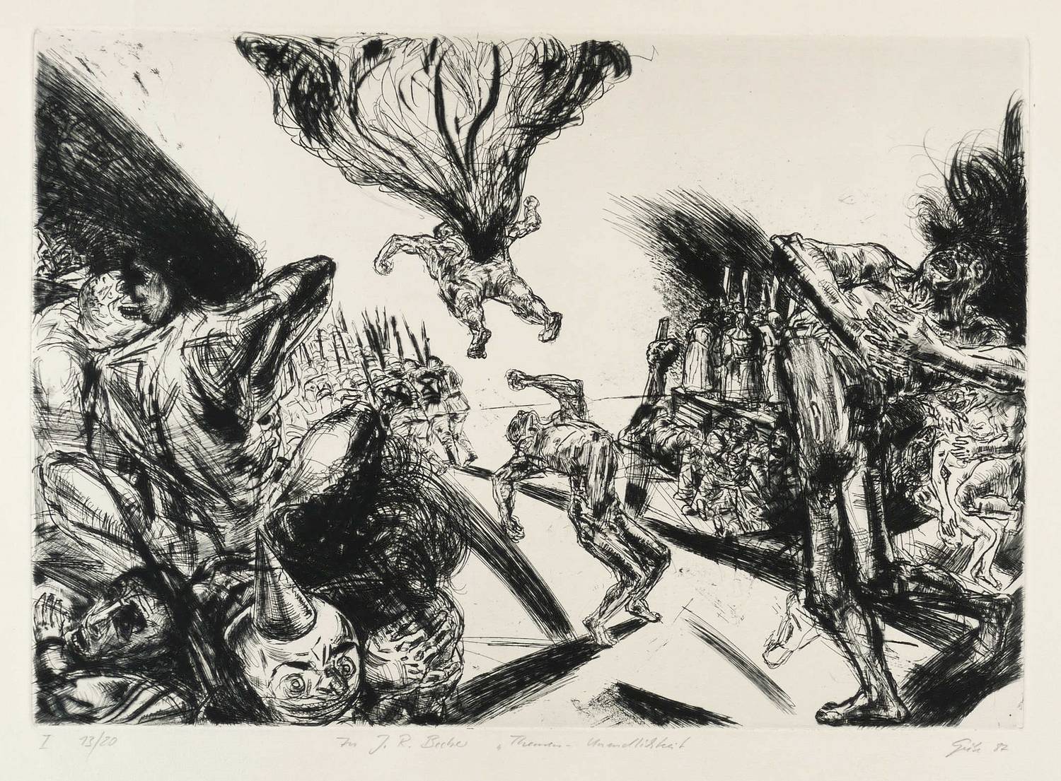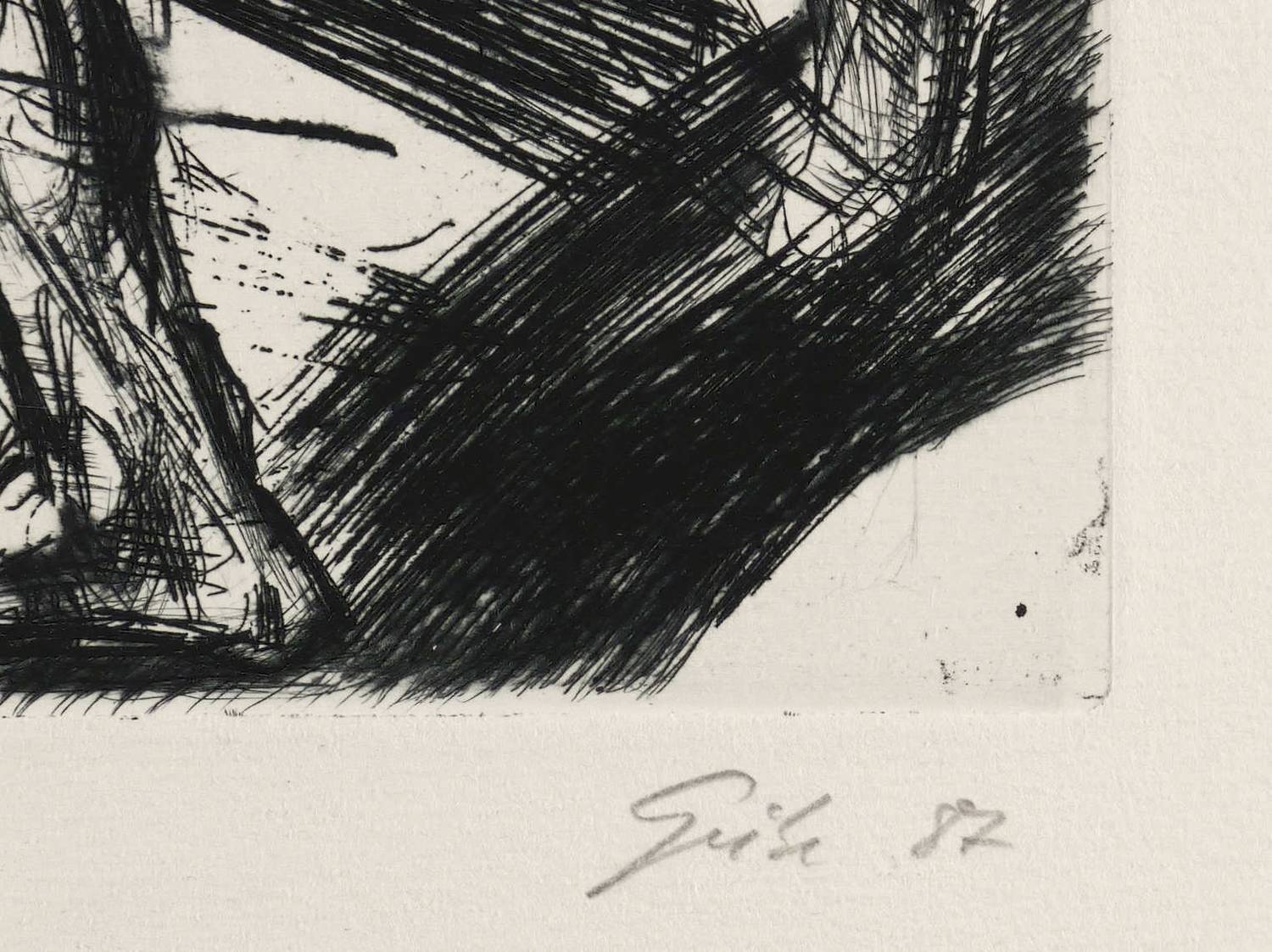 1987. Radierung / Strichätzung & Kaltnadel, in Schwarz, auf gelbem Hahnemühle-Bütten. – Originale Künstlergrafik, von Hubertus Giebe. – Auflage Exemplar Nr. 13/20. – 41,3 x 59,2 cm (Darstellung / Platte), 62 x 85 cm (Blatt).