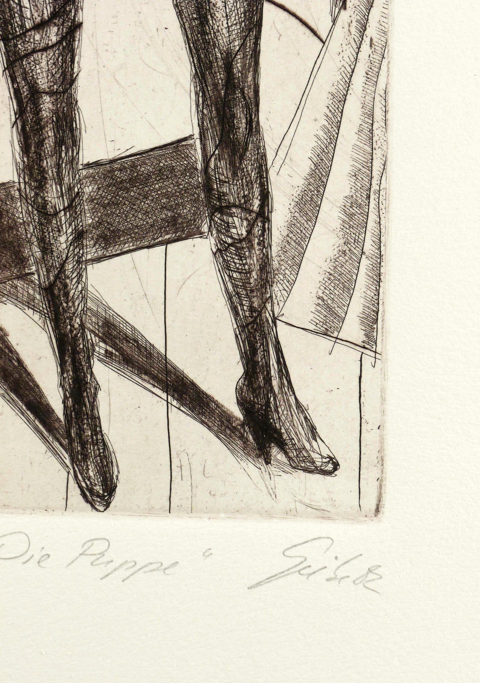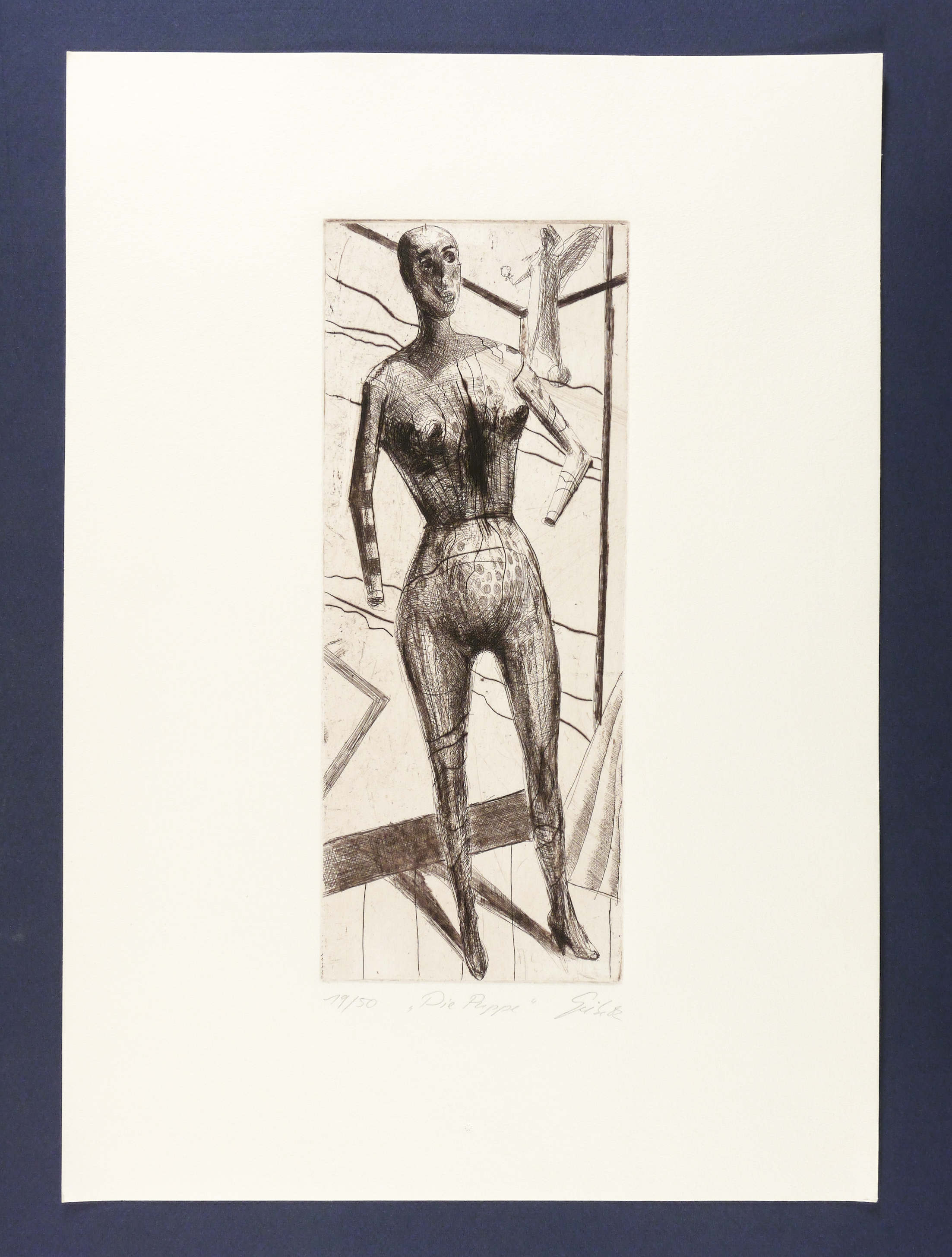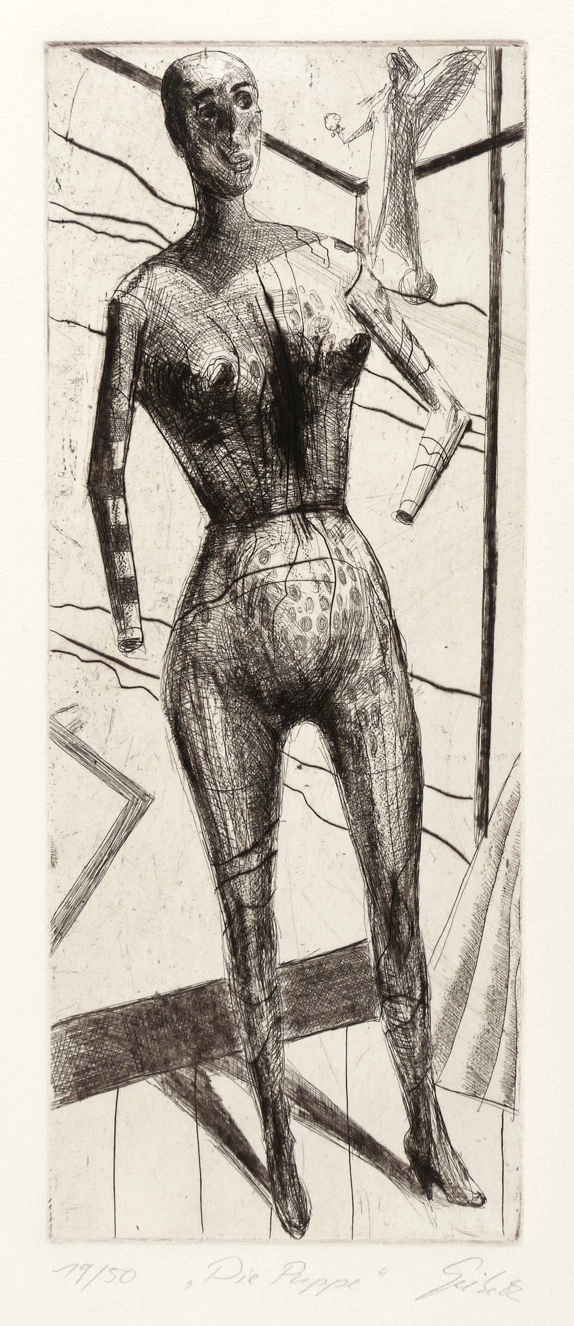 1982. Radierung / Strichätzung & Roulette, mit Plattenton, in Rotschwarz, auf Weißenborn-Bütten. – Von Hubertus Giebe. – Auflage Exemplar Nr. 19/50. – 31,7 x 12,5 cm (Darstellung / Platte), 48 x 34 cm (Blatt).