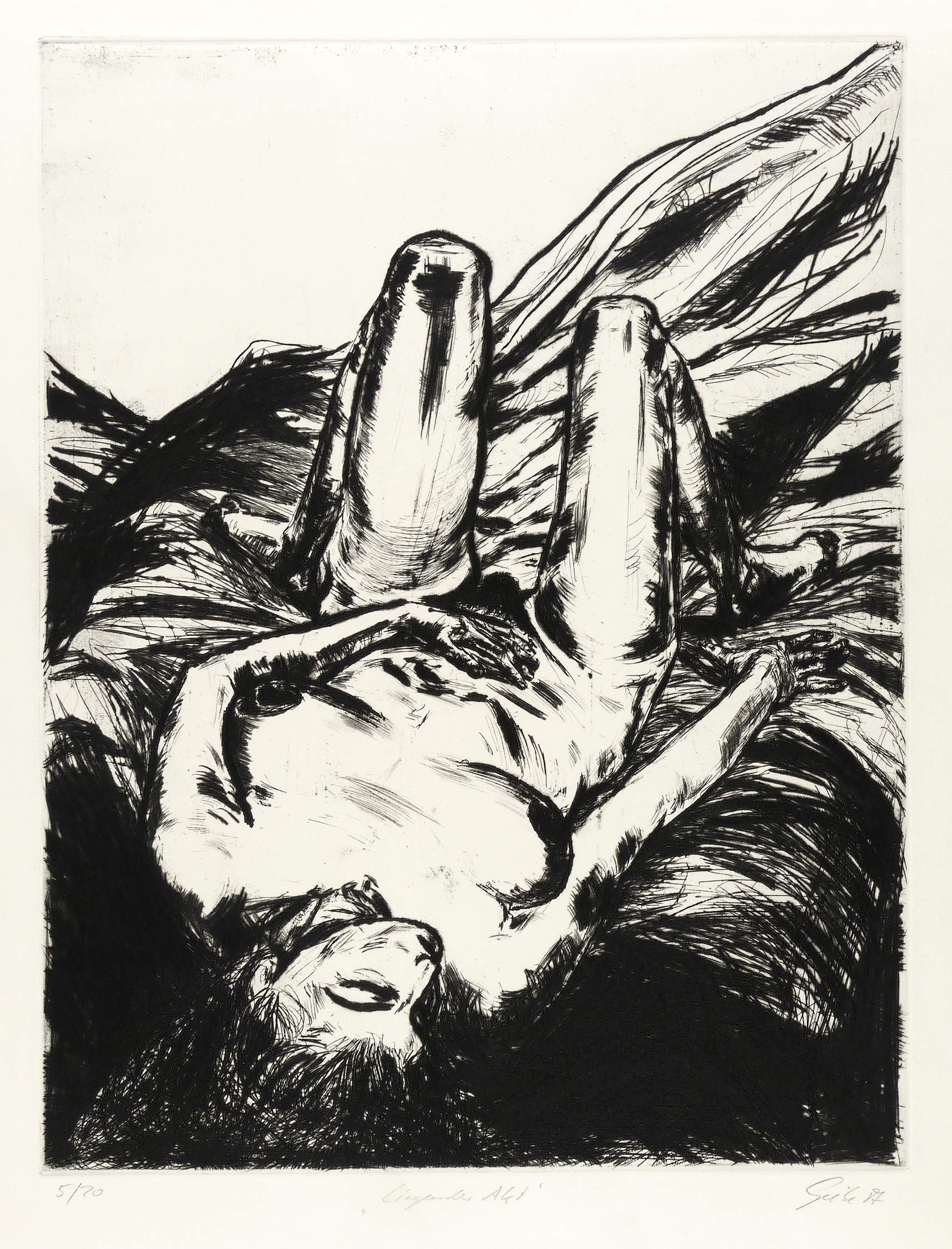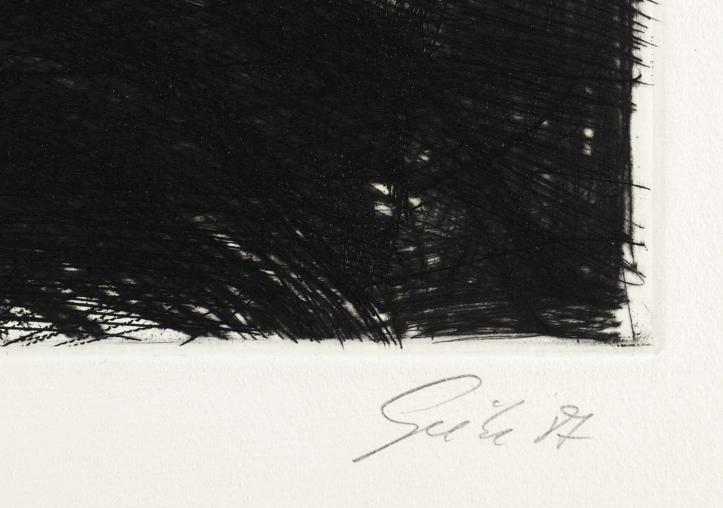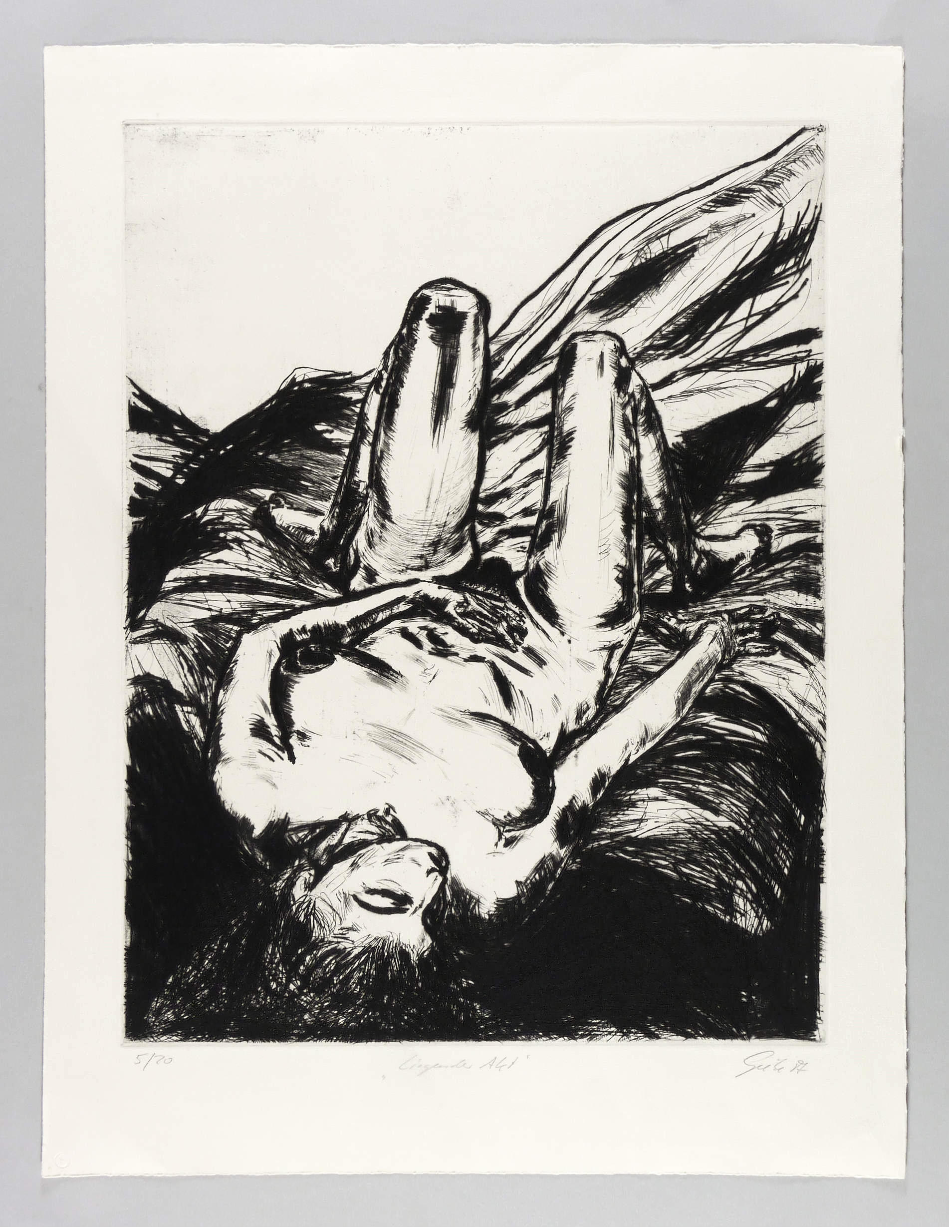 1987. Radierung / Strichätzung, in Schwarz, auf hellchamois Hahnemühle-Bütten. – Originale Künstlergrafik, von Hubertus Giebe. – Auflage Exemplar Nr. 5/20. – 46,4 x 49,3 cm (Darstellung / Platte), 79 x 60 cm (Blatt).