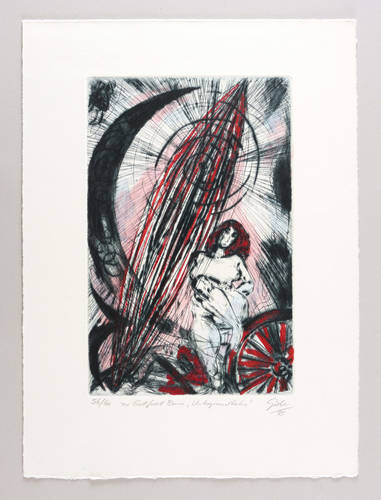 1993. Radierung / Strichätzung & Kaltnadel, in Schwarzblau, aquarelliert, auf hellchamois Velin. – Originale Künstlergrafik, von Hubertus Giebe. – Auflage Exemplar Nr. 56/60. – 37,5 x 24,2 cm (Darstellung / Platte), 54 x 40 cm (Blatt).