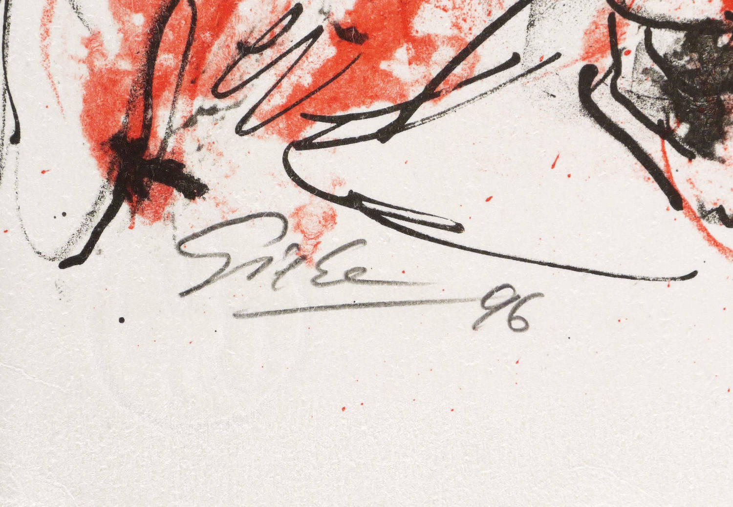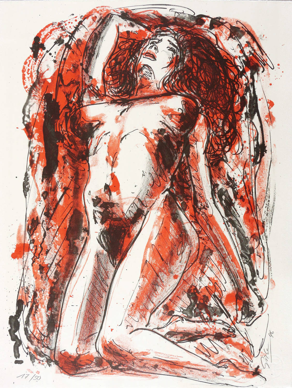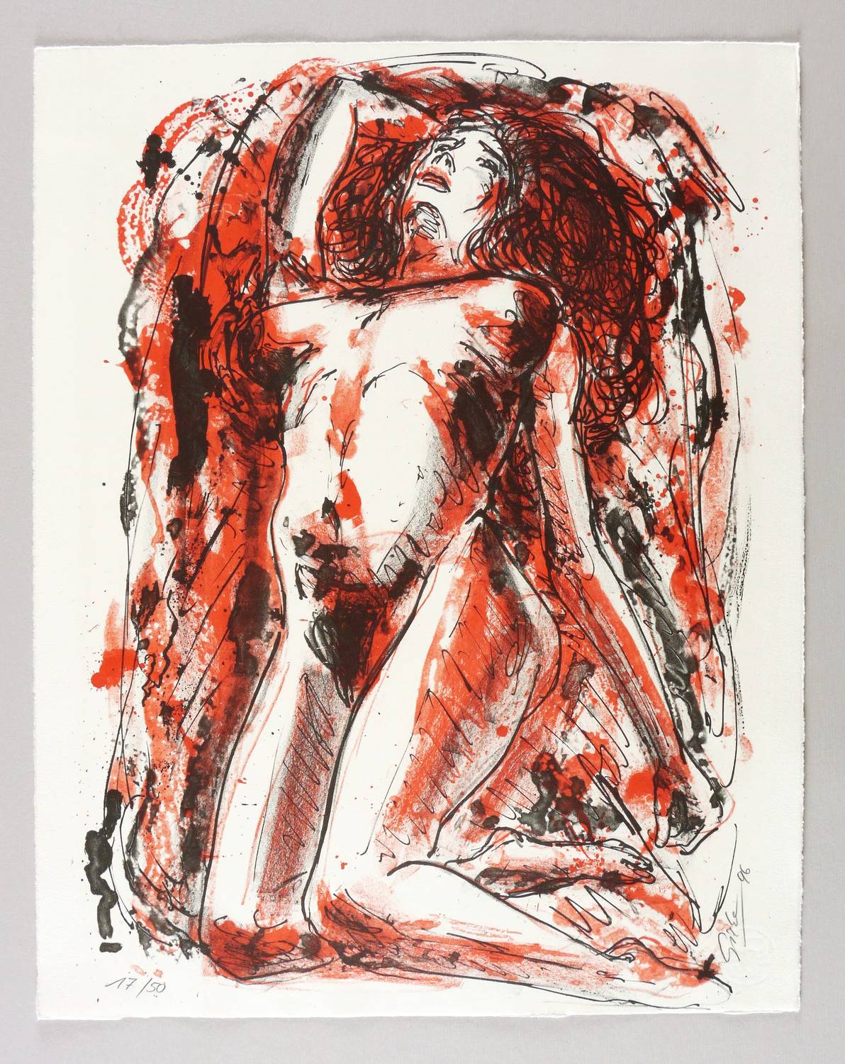 1996. Farblithografie / Kreidelithografie, in Rot & Schwarz, auf hellchamois Hahnemühle-Bütten. – Originale Künstlergrafik, von Hubertus Giebe. – Auflage Exemplar Nr. 17/50. – 49,0 x 35,3 cm (Darstellung / Druckbild), 50 x 40 cm (Blatt).