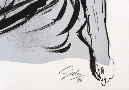 1996. Farblithografie / Kreidelithografie, in Schwarz, über grauer Tonplatte, auf hellchamois Velin. – Originale Künstlergrafik, von Hubertus Giebe. – Auflage Exemplar Nr. 17/50. – 48,7 x 34,4 cm (Darstellung / Druckbild), 50 x 40 cm (Blatt).