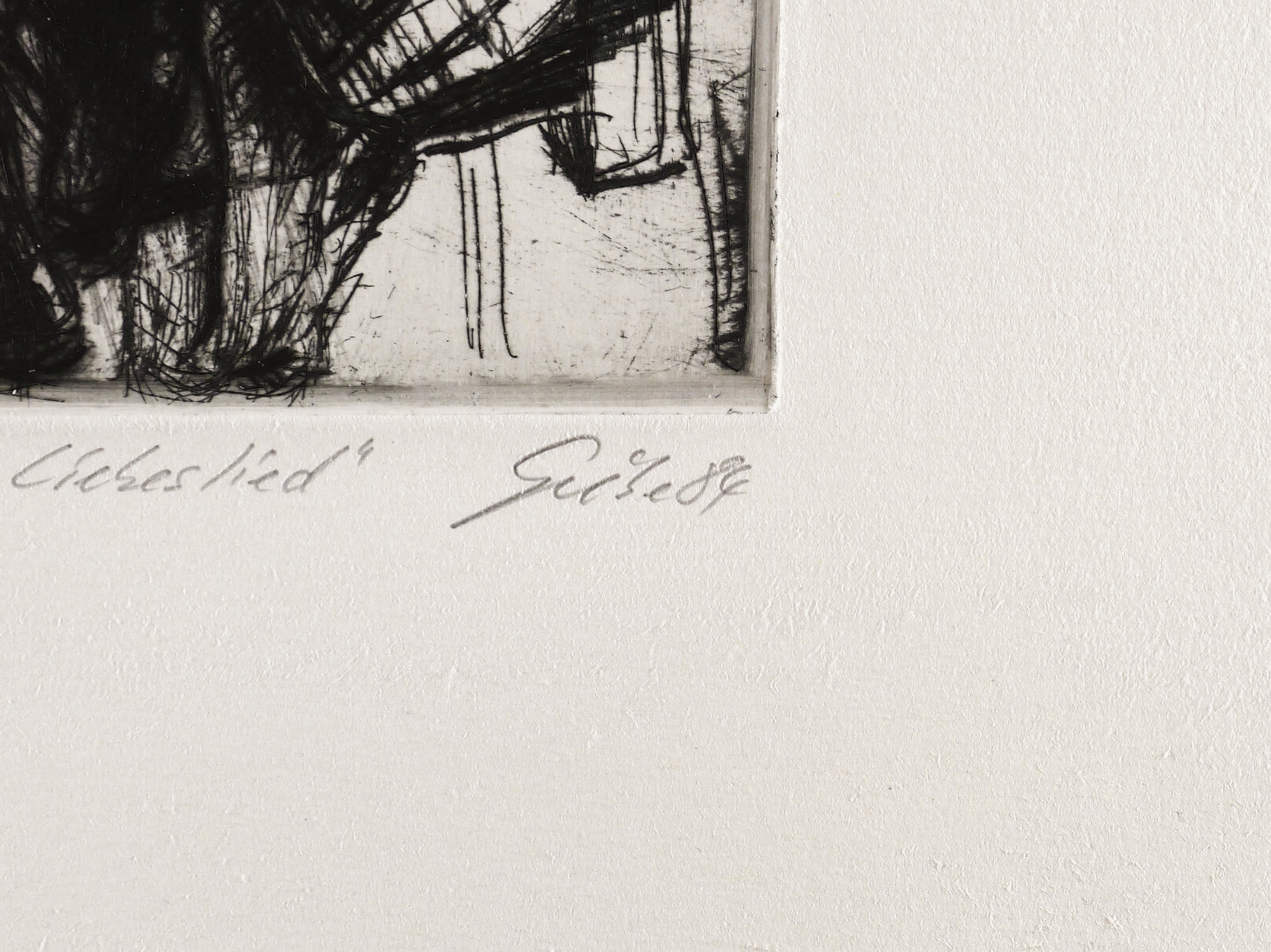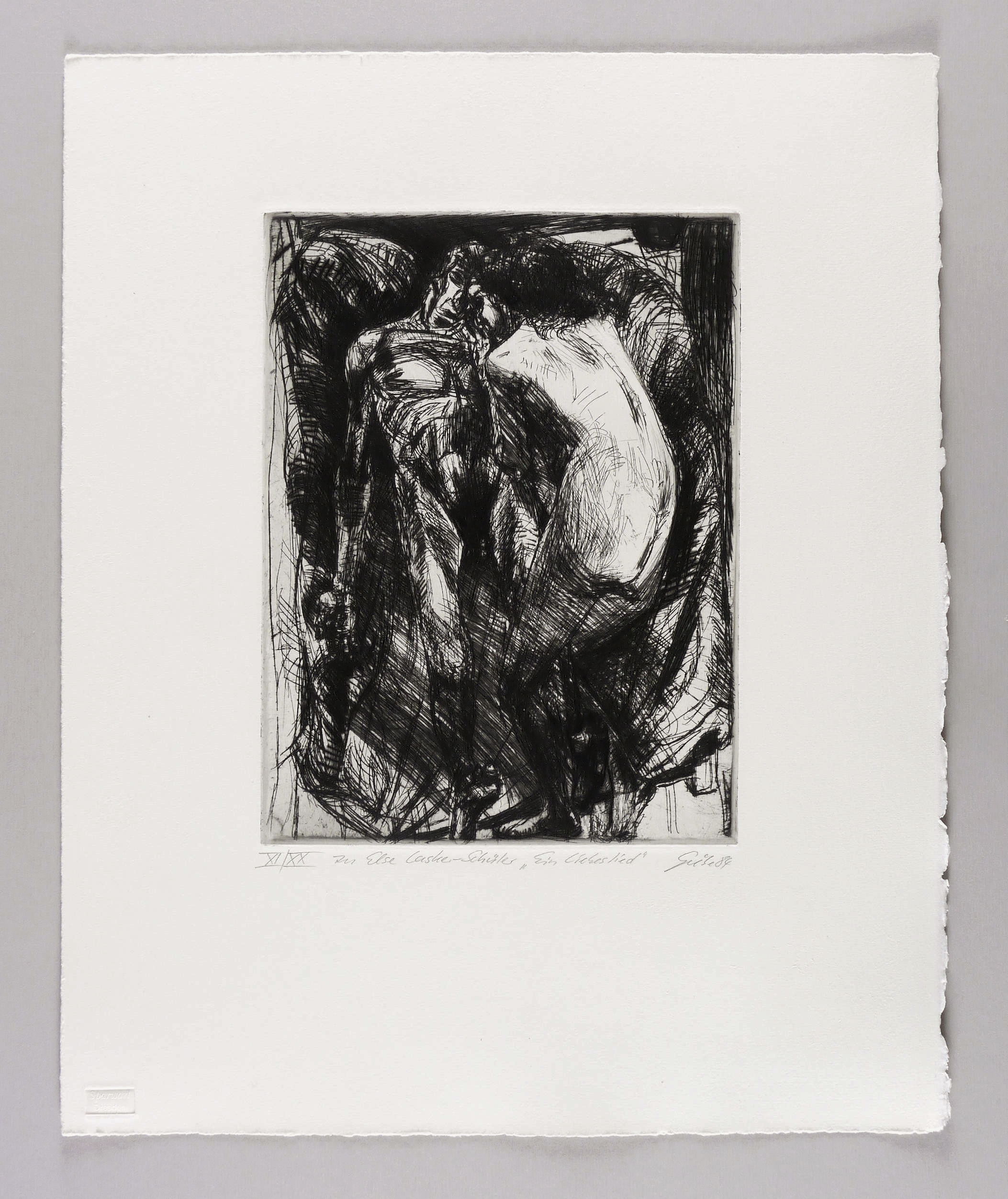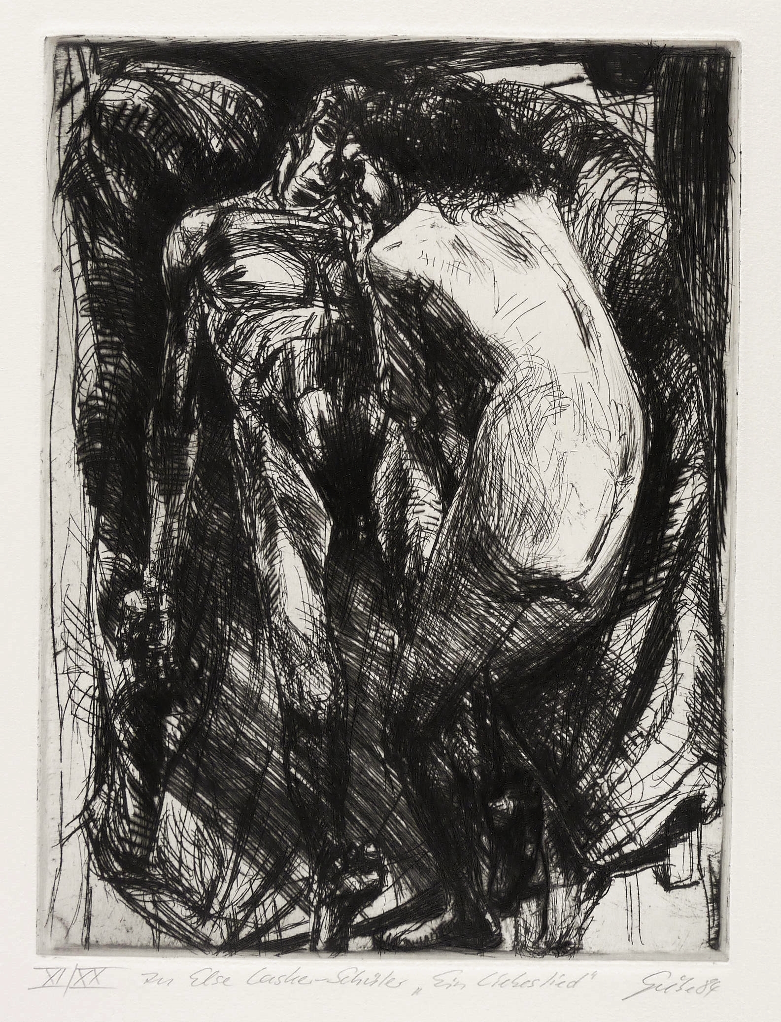 Rechts unten in Bleistift signiert und datiert: ″Giebe 84″. Links Auflagenbezeichnung und Titel: ″XI/XX // zu Else Lasker-Schüler 'Ein Liebeslied''″. Trockenstempel des Druckers Heinz Sparwart. – Exemplar der römisch nummerierten Vorzugsauflage. – Tadellos. Sehr guter Zustand.