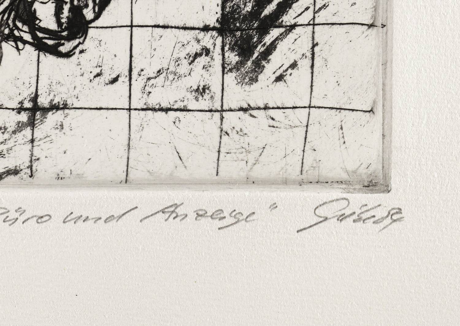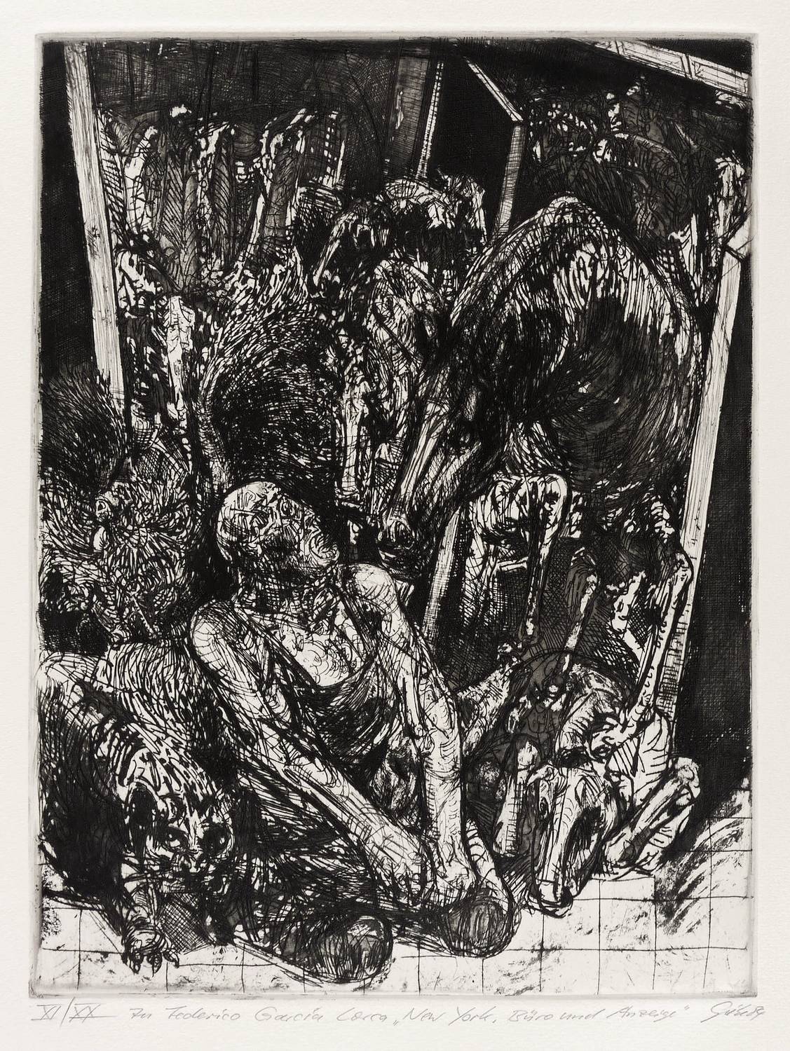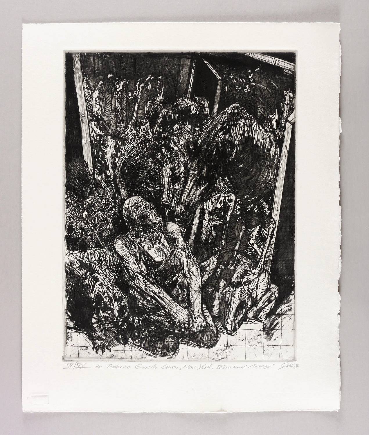 Rechts unten in Bleistift signiert und datiert: ″Giebe 84″. Links Auflagenbezeichnung und Titel: ″XI/XX // zu Federico Garcia Lorca 'New York. Büro und Anzeige'″. Trockenstempel des Druckers Heinz Sparwart. – Exemplar der römisch nummerierten Vorzugsauflage. – Tadellos. Sehr guter Zustand.