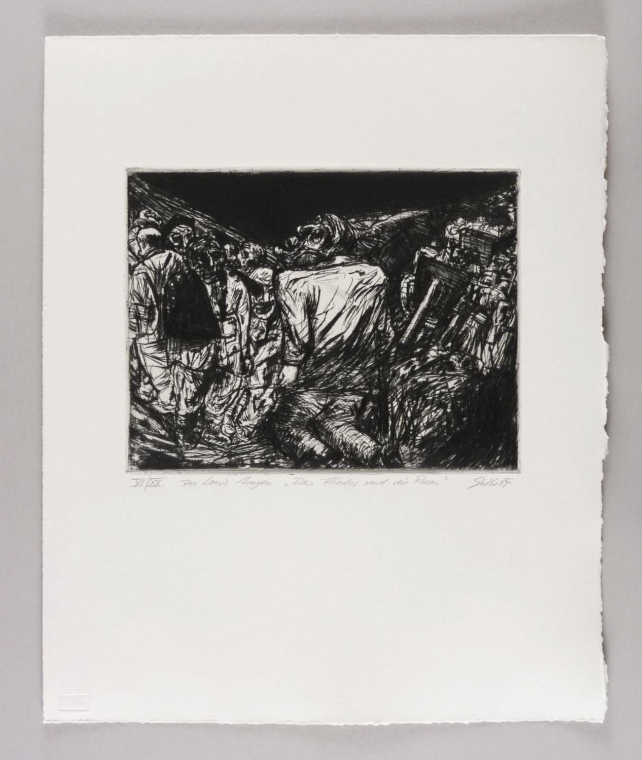 1984. Radierung / Strichätzung & Kaltnadel, in Schwarz, auf schwerem hellchamois Hahnemühle. – Originale Künstlergrafik, von Hubertus Giebe. – Auflage Exemplar Nr. XI/XX. – 24,8 x 32,0 cm (Darstellung / Platte), 56 x 46 cm (Blatt).