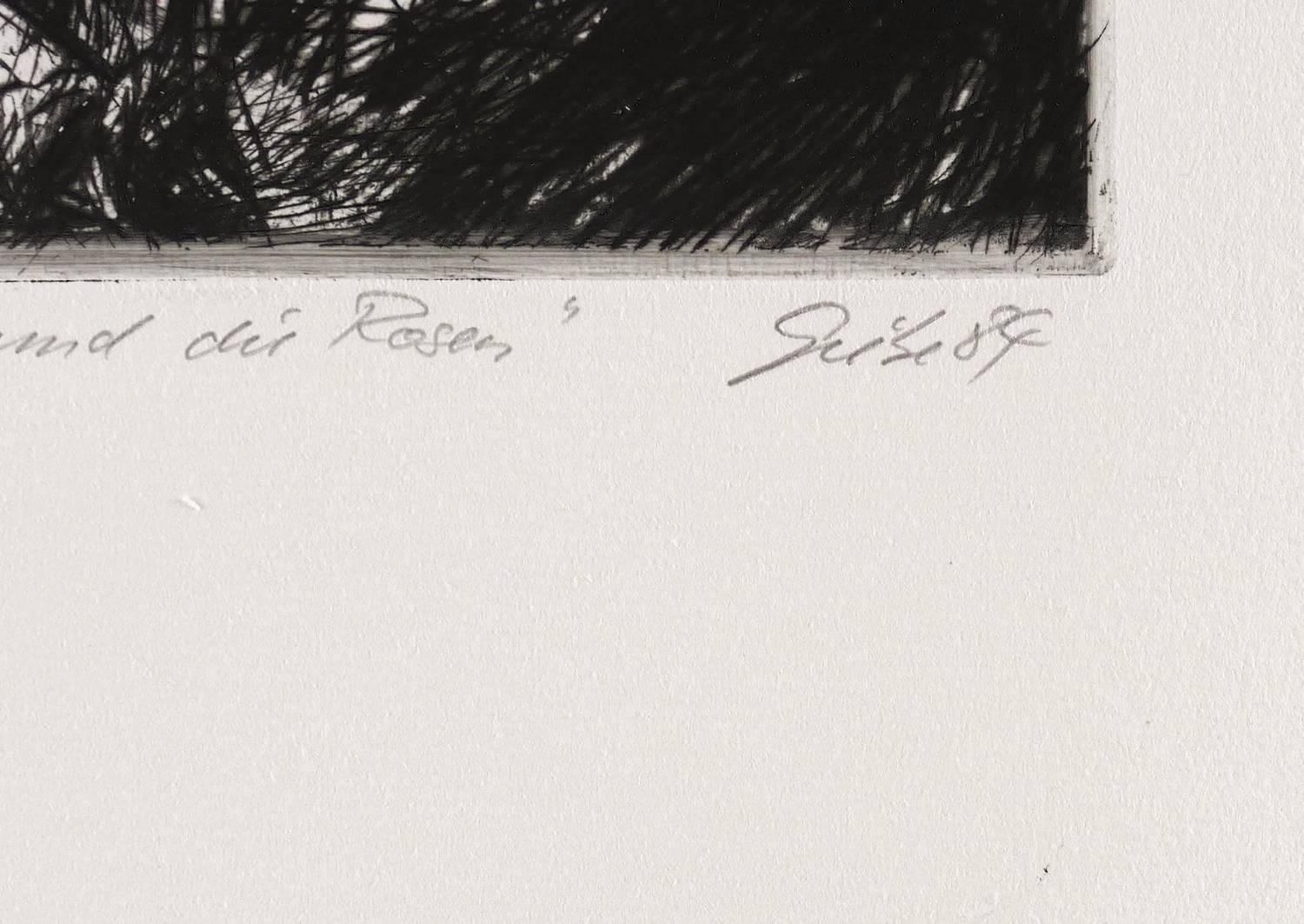 Rechts unten in Bleistift signiert und datiert: ″Giebe 84″. Links Auflagenbezeichnung und Titel: ″XI/XX // zu Louis Aragon 'Der Flieder und die Rosen'″. Trockenstempel des Druckers Heinz Sparwart. – Exemplar der römisch nummerierten Vorzugsauflage. – Tadellos. Sehr guter Zustand.