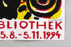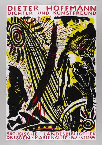 Rechts unten in Bleistift signiert und datiert: ″Giebe 94″. Links Auflagenbezeichnung: ″13/40″. – Originalgrafisches Künstlerplakat zur Ausstellung ″Dieter Hoffmann. Dichter und Kunstfreund″ in der Sächsischen Landesbibliothek Dresden 15.8.-5.11.1994. – Originalrandig. Ehemaliger Horizontalfalz im unteren Randbereich weitgehend geglättet. Mäßig guter Zustand.