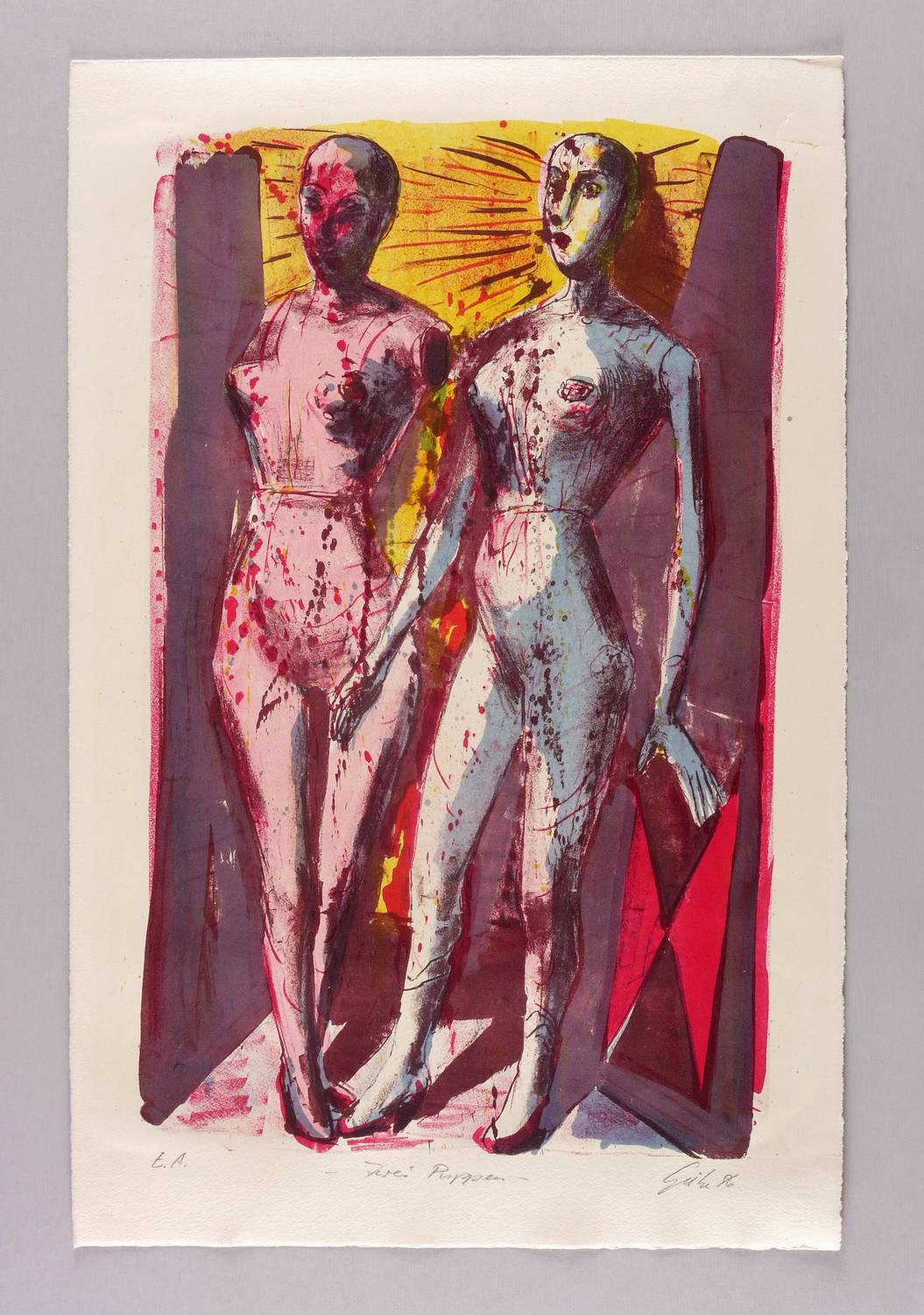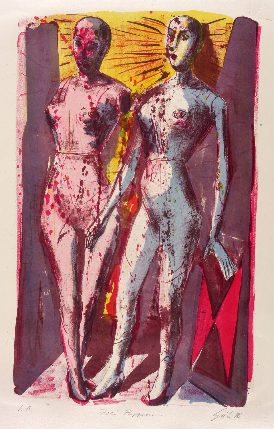 Rechts unten in Bleistift signiert und datiert: ″Giebe 86″. Links Auflagenbezeichnung: ″E.A.″ Mittig Titel: ″Zwei Puppen″. Wasserzeichen der Hahnemühle. – Provenienz: Sammlung Gerlint Söder & Erhard Frommhold, Dresden. – Geringfügige Lager- und Griffspuren. Insgesamt guter Zustand.