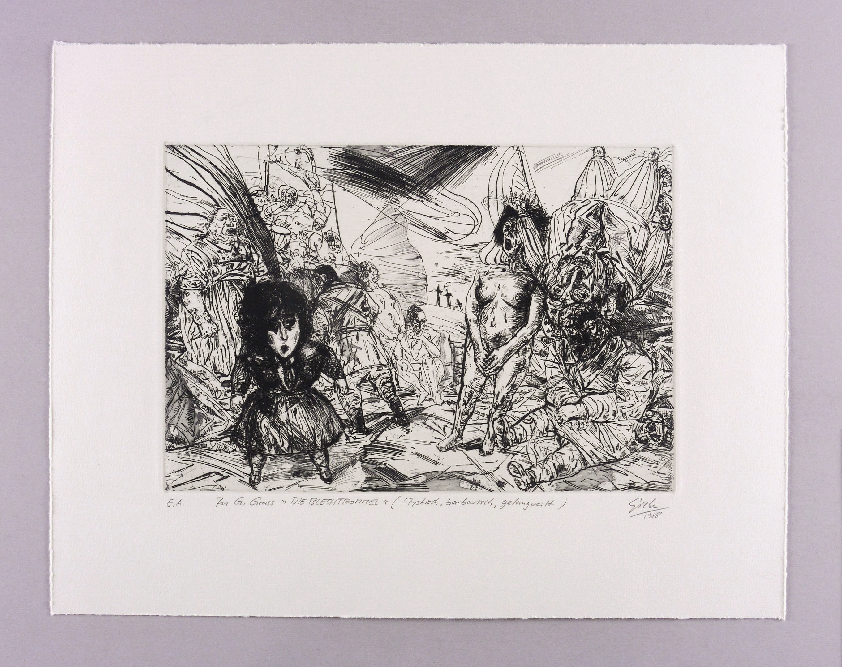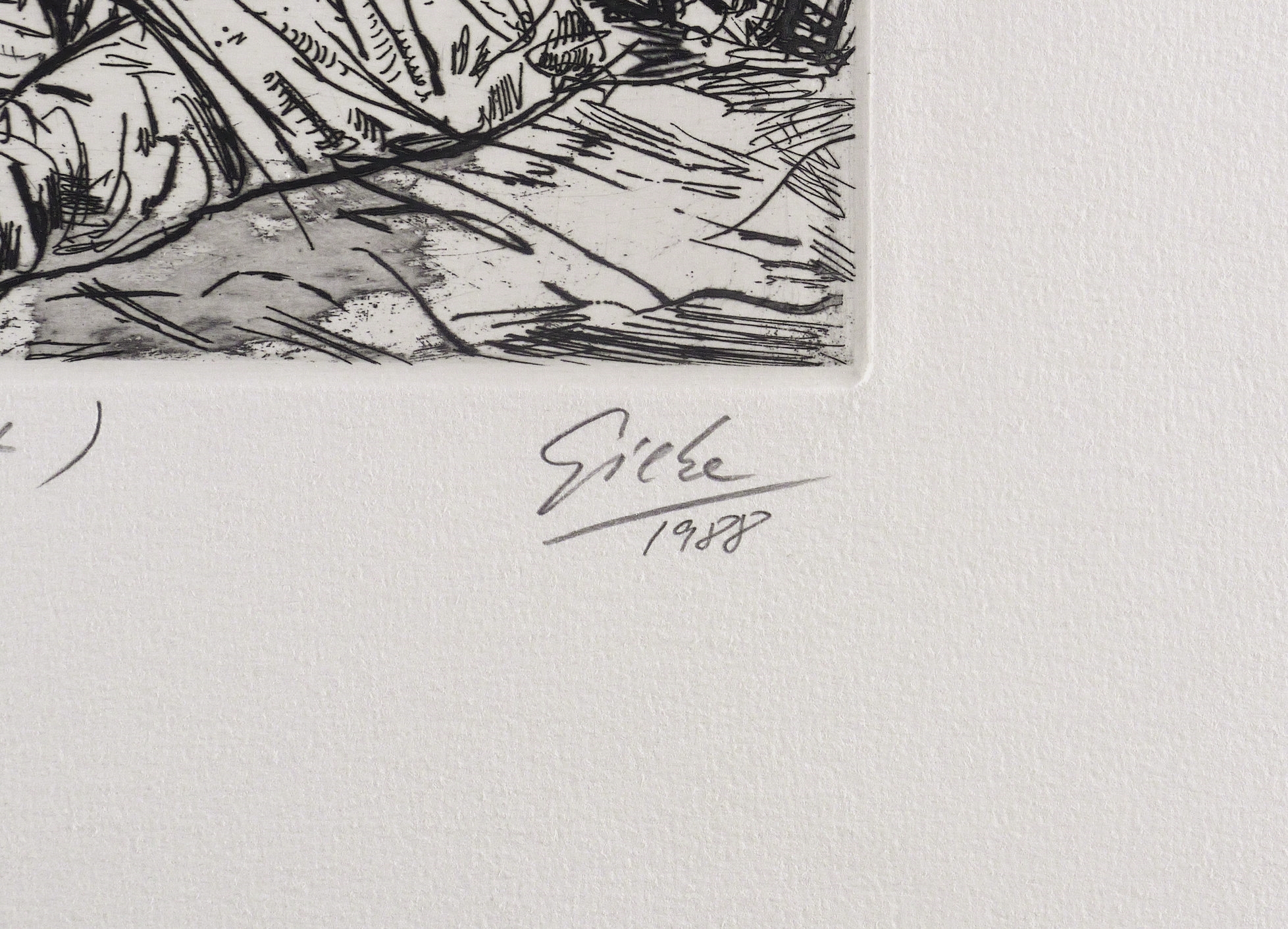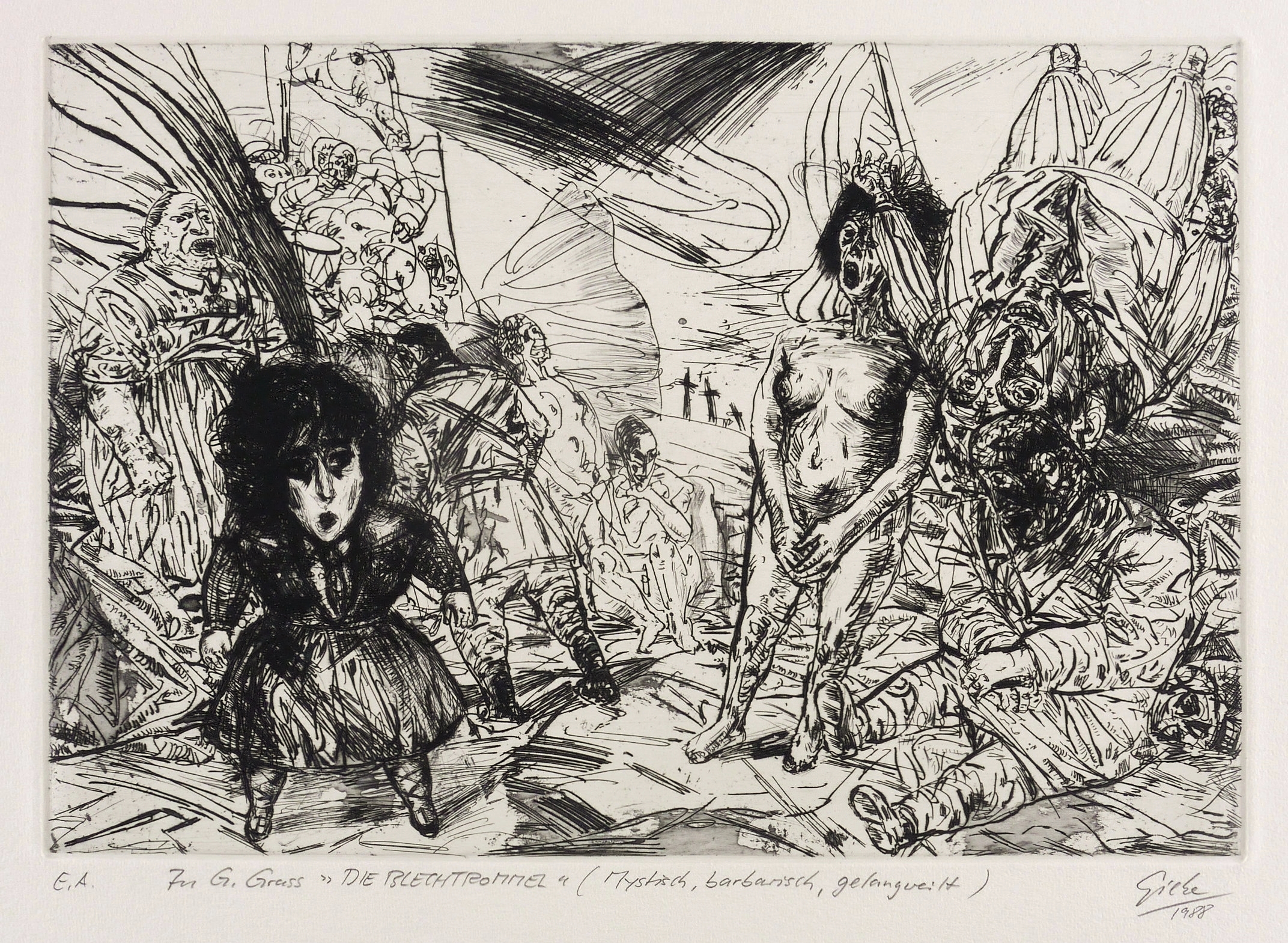 Rechts unten in Bleistift signiert und datiert: ″Giebe 1988″. Links Auflagenbezeichnung: ″E.A.″ Mittig Titel: ″Zu G. Gras 'DIE BLECHTROMMEL' (Mystisch, barbarisch, gelangweilt)″. – Ohne Mängel. Sehr guter Zustand.