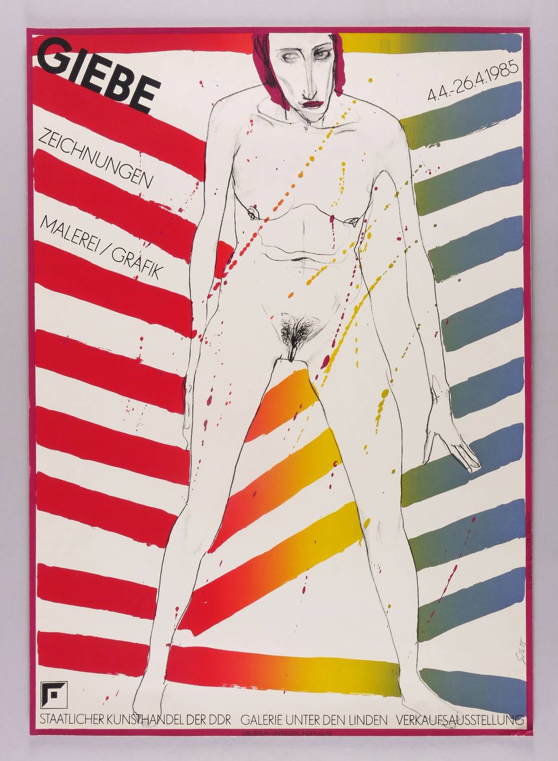 Rechts unten in Bleistift signiert und datiert: ″Giebe 85″. – Originalgrafisches Plakat zur Ausstellung ″Giebe - Zeichnungen Malerei Grafik″ 1985 in der Galerie Unter den Linden in Berlin. – Marginale Lagerspuren, Blattecke rechts unten bestoßen. Guter Zustand.