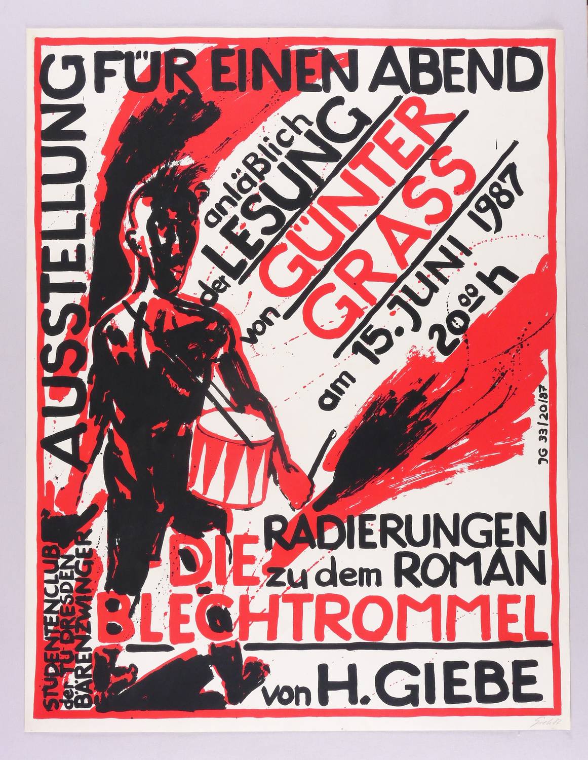 Rechts unten in Bleistift signiert und datiert: ″Giebe 87″. Diverse Inschriften im Stein. – Originalgrafisches Plakat zur Ausstellung ″Radierungen zu dem Roman 'Die Blechtrommel' von Hubertus Giebe″ am 15.06.1987 im Studentenclub Bärenzwinger der TU Dresden anlässlich einer Lesung von Günter Grass ebenda. – Guter Zustand.