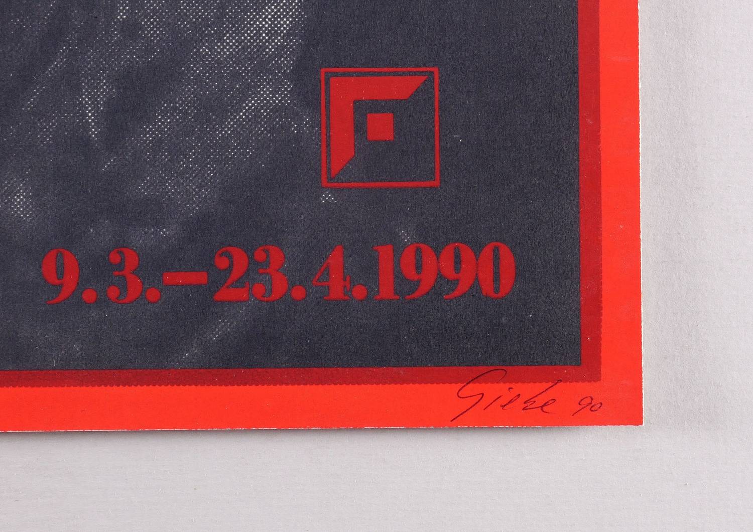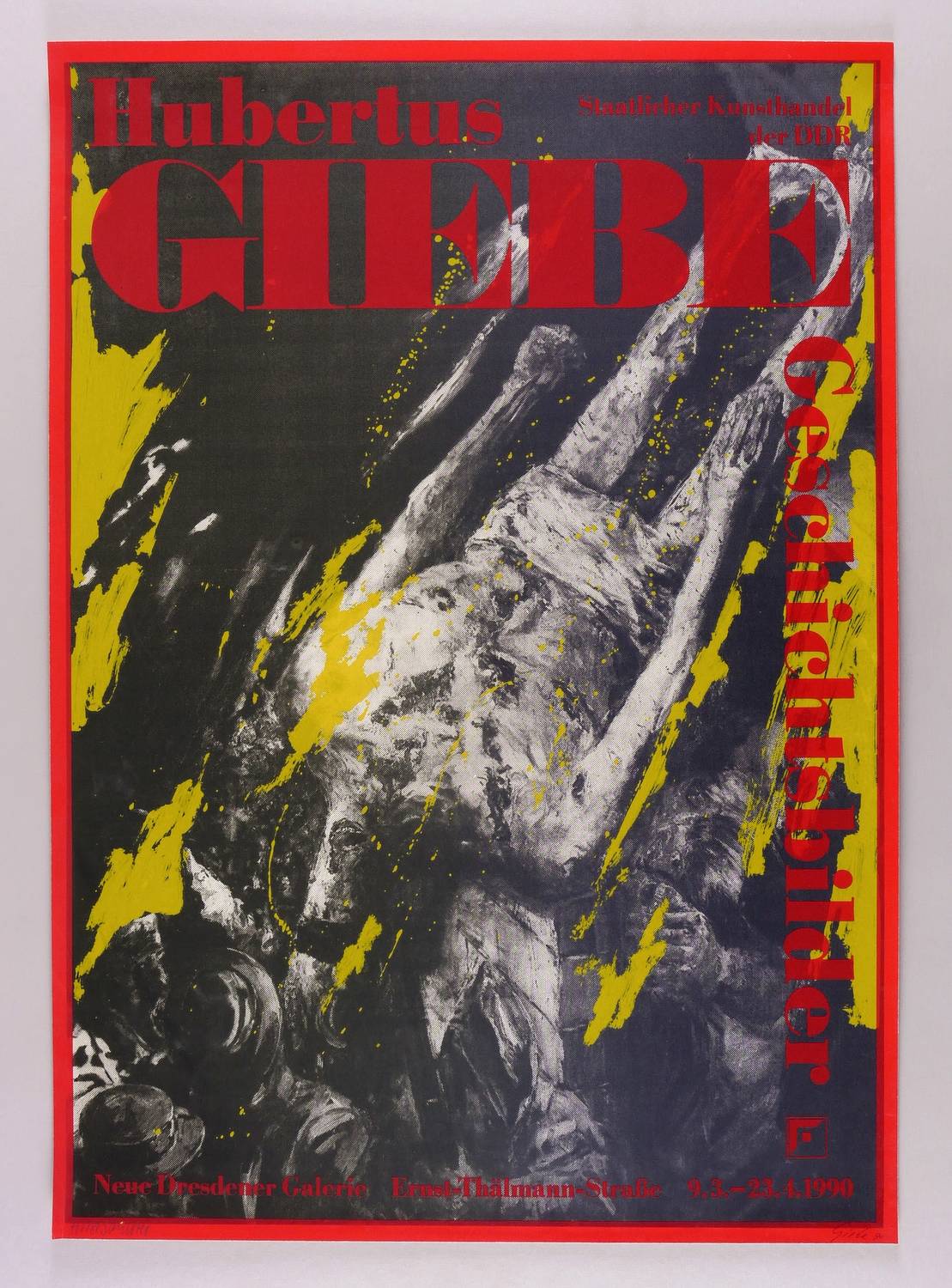 Rechts unten in Bleistift signiert und datiert: ″Giebe 90″. Links: ″Schuster″. – In Zusammenarbeit mit dem Gestalter Horst Schuster. – Originalgrafisches Künstlerplakat zur Ausstellung ″Hubertus Giebe. Geschichtsbilder″ der Neuen Dresdener Galerie in Dresden 9.3.-23.4.1990. – Tadellos. Sehr guter Zustand.